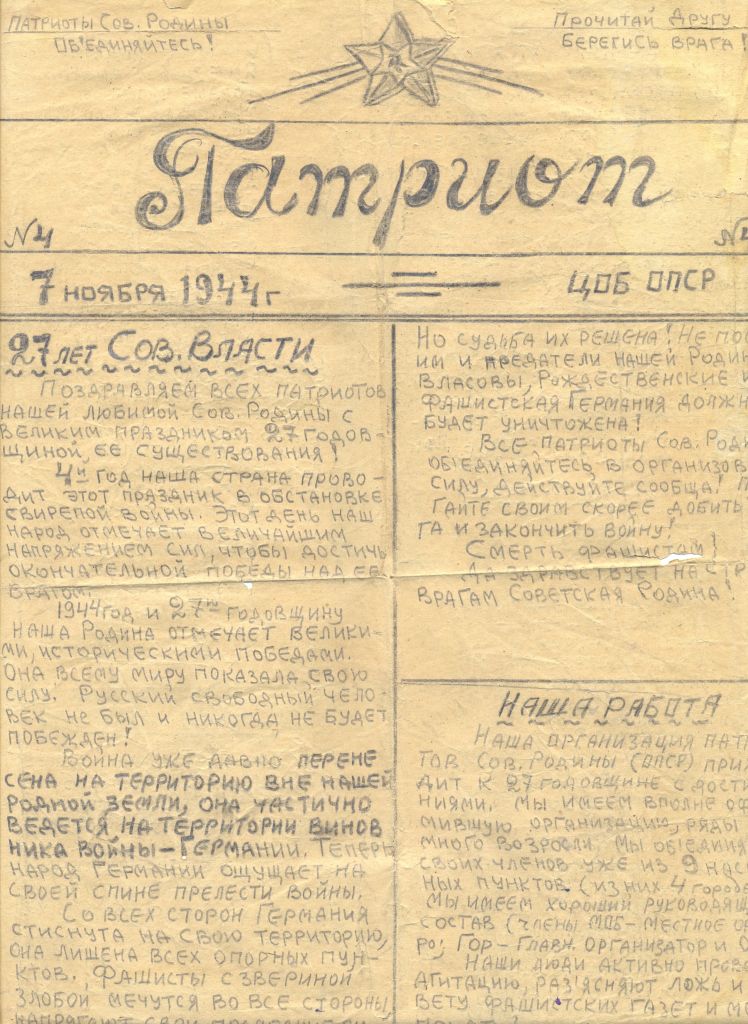Газета «Патриот», изданная в лагере для военнопленных в г. Цербст (Германия) членами «Организации патриотов Советской Родины» из дела К.Г. Гуреева. 1944 год.