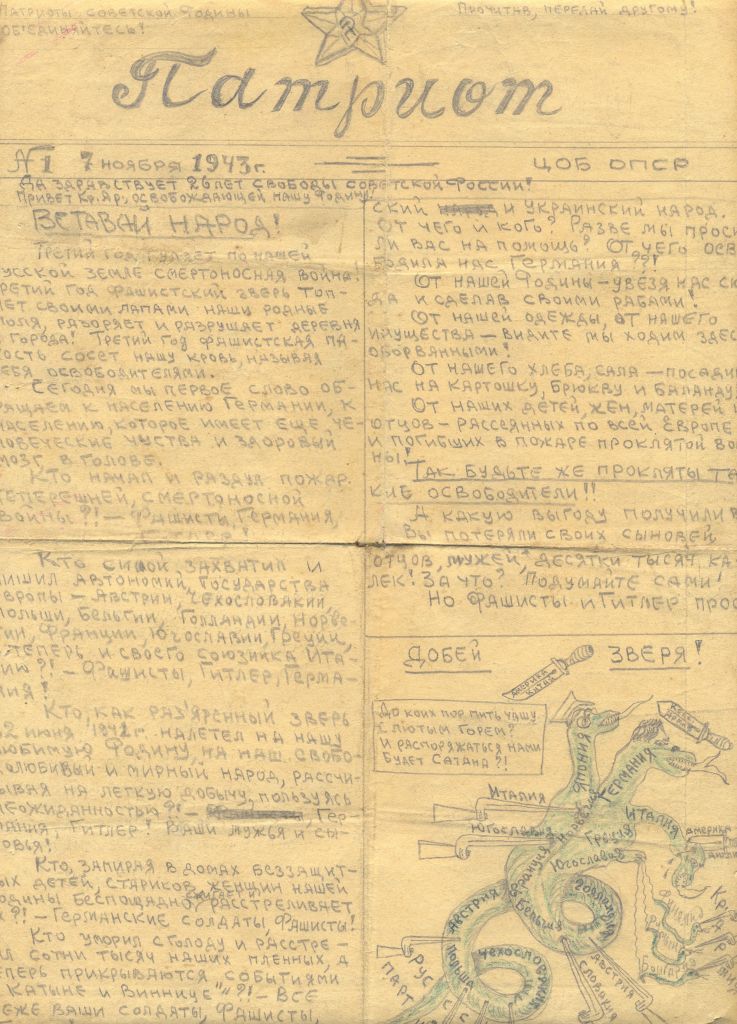 Газета «Патриот», изданная в лагере для военнопленных в г. Цербст (Германия) членами «Организации патриотов Советской Родины» из дела К.Г. Гуреева. 1943 год.