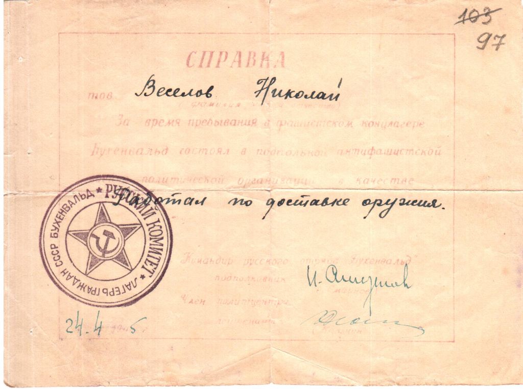 Справка члена «Русского комитета Бухенвальда» Николая Федоровича Веселова. 1945 год.