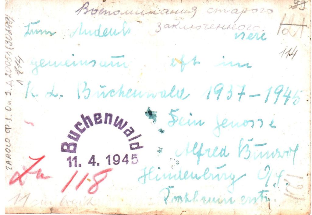 Фотография бывших узников Бухенвальда. Оборотная сторона с заметками Николая Федоровича Веселова. 1945 год.