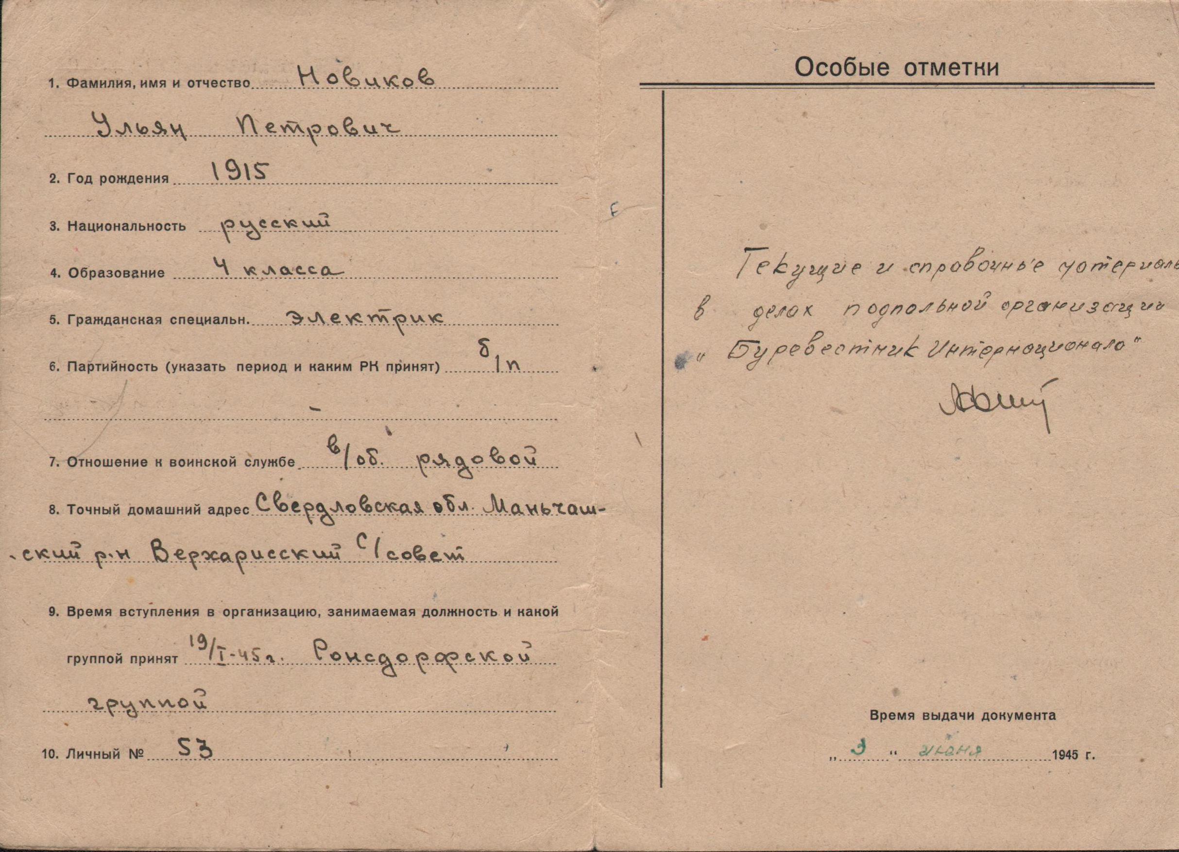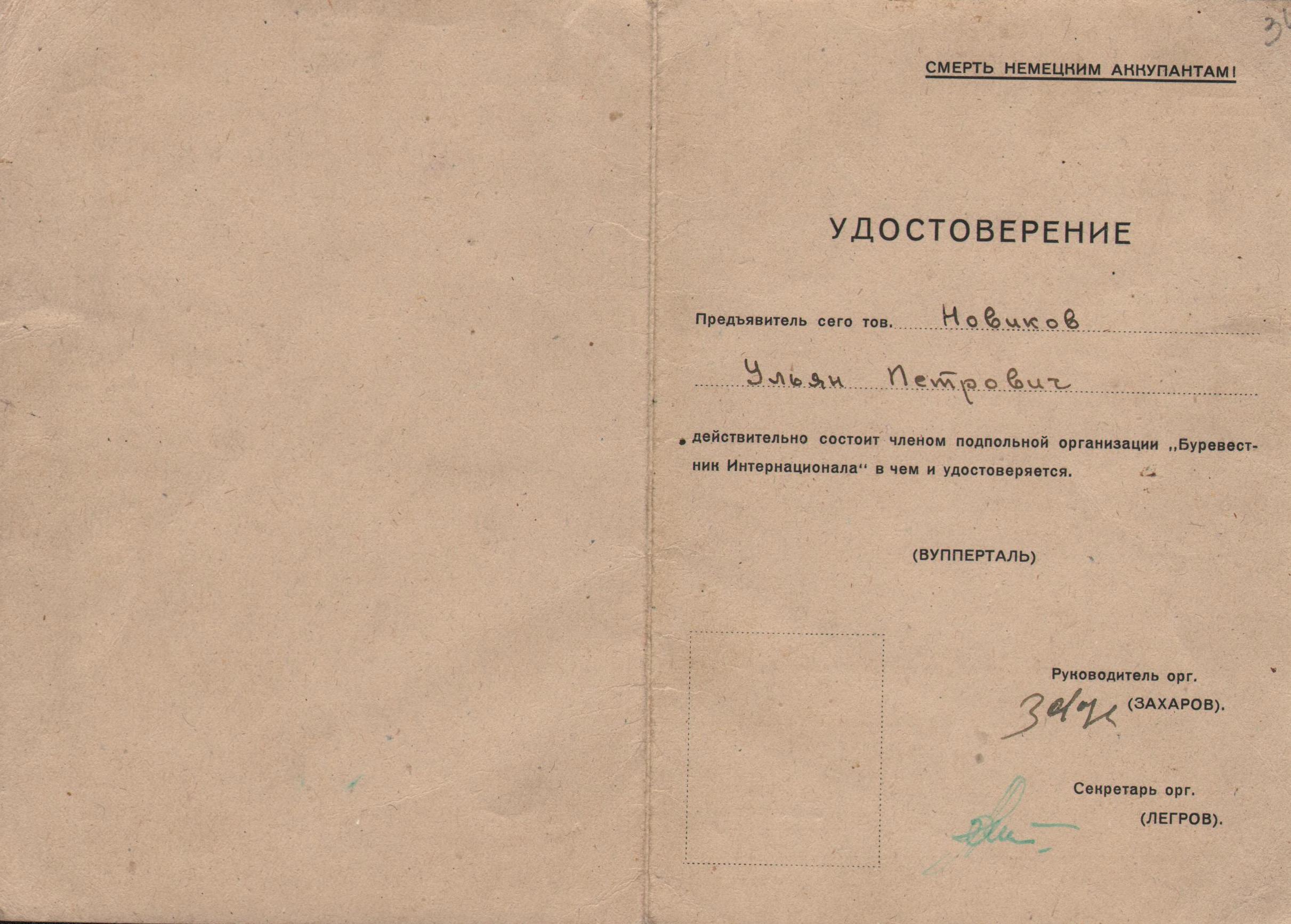 Удостоверение члена подпольной организации «Буревестник Интернационала» в Вуппертале (Германия) Ульяна Петровича Новикова. 3 июня 1945 года.