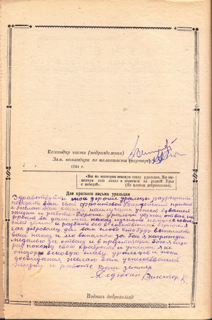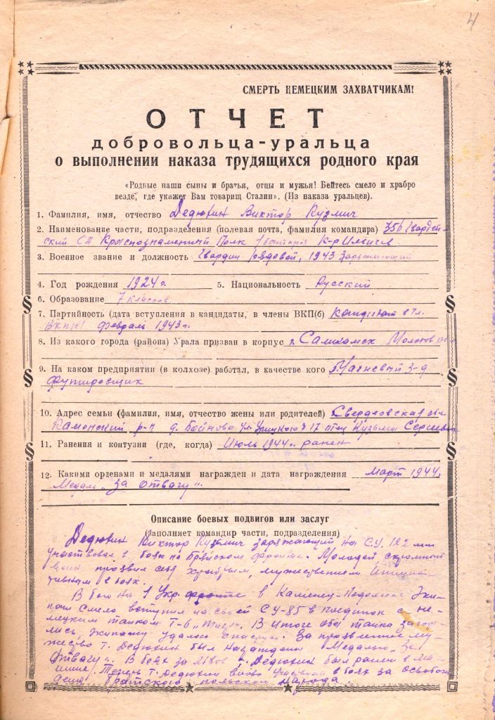Отчет уральца-добровольца В.К. Дедюхина о выполнении наказа трудящихся родного края. 1944 г.