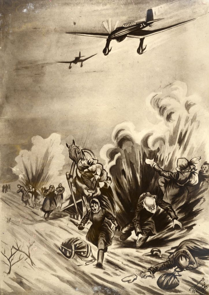 Гаврилов Георгий, ученик 10 класса школы № 1 (г. Свердловск). Фашисты бомбят стариков и детей. Рисунок. 1943 г.