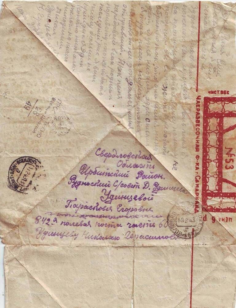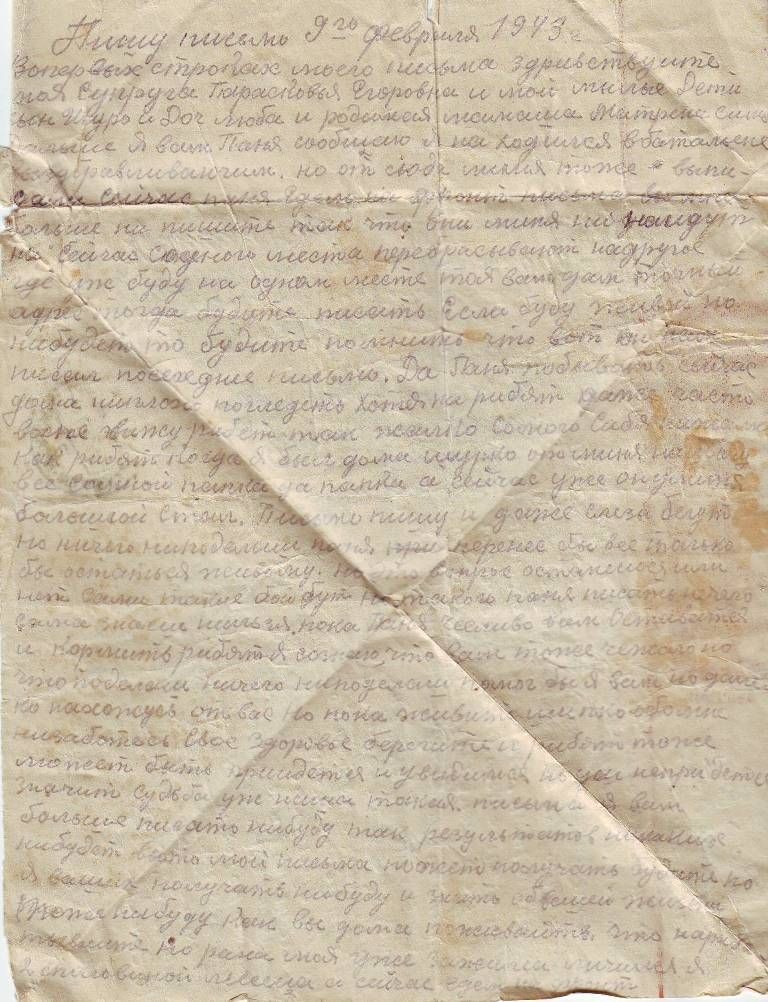 Письмо, написанное Н.Г. Удинцевым своей жене Парасковье Егоровне 9 февраля 1943 года.