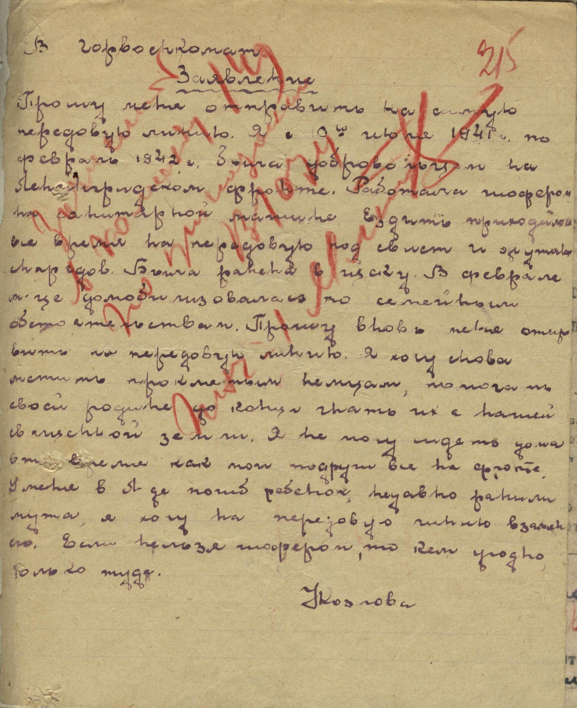 Заявление Нины Павловны Козловой в Каменский горвоенкомат о призыве на фронт. 1943 год.