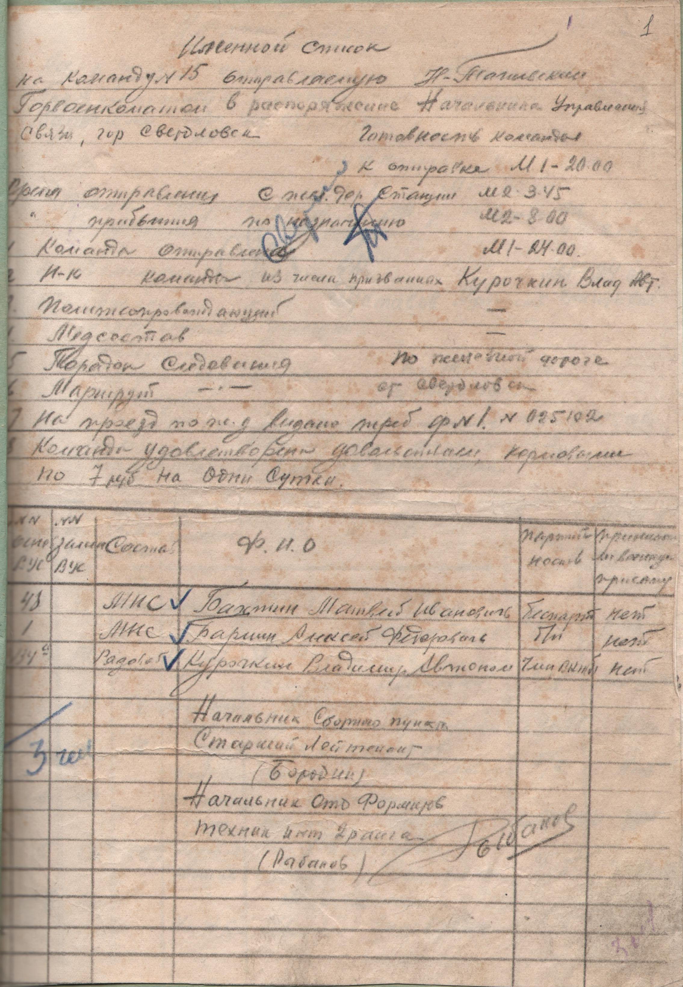 Именной список на команду, направленную Ленинским РВК г. Нижний Тагил в распоряжение начальника Управления связи г. Свердловск. 23 июня 1941 года.