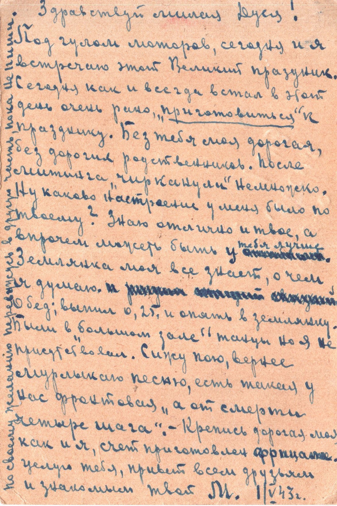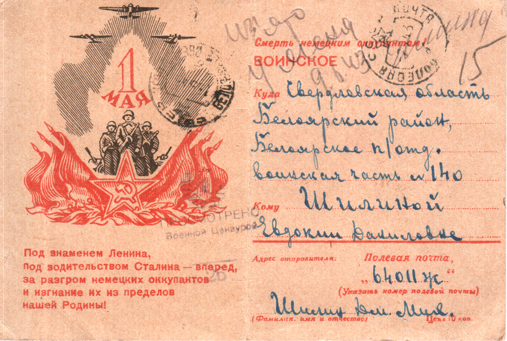 Почтовая карточка с фронта от М. Шилина. 1 мая 1943 года.