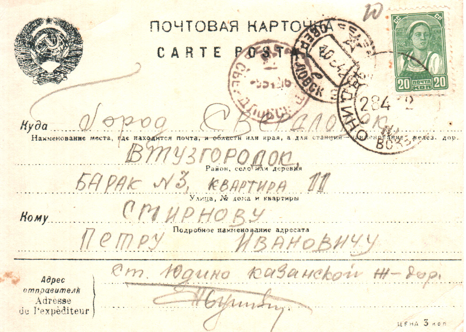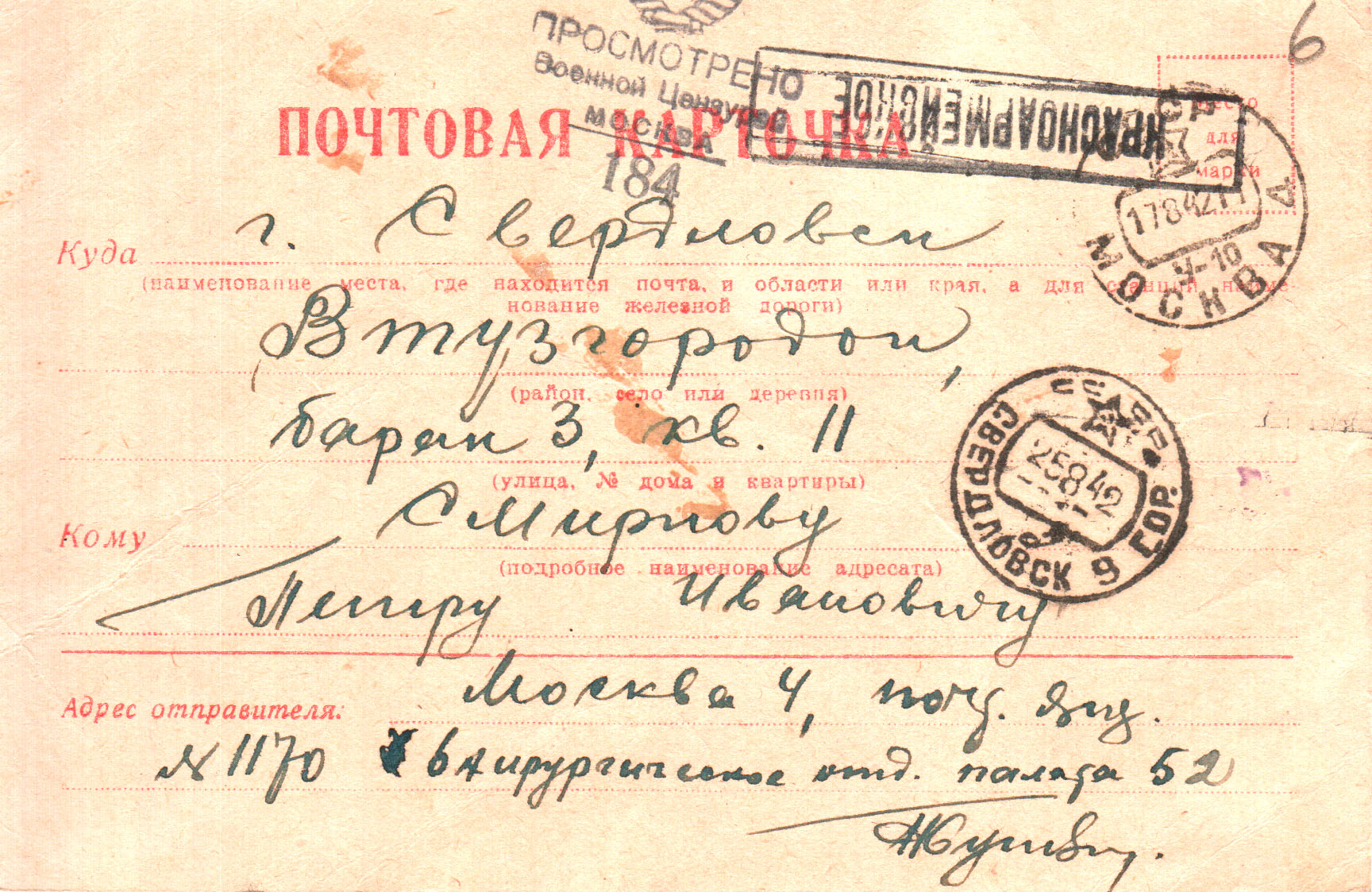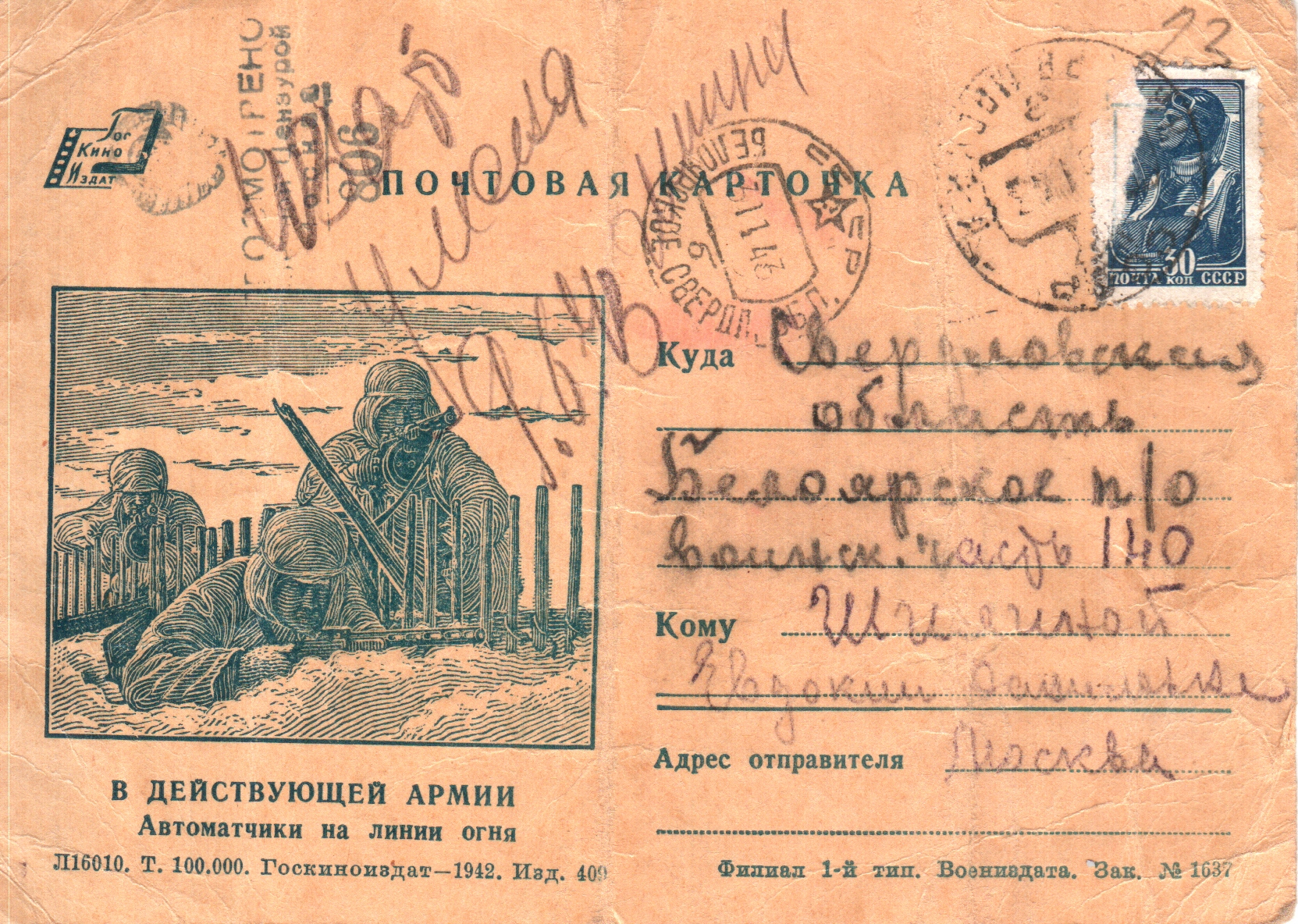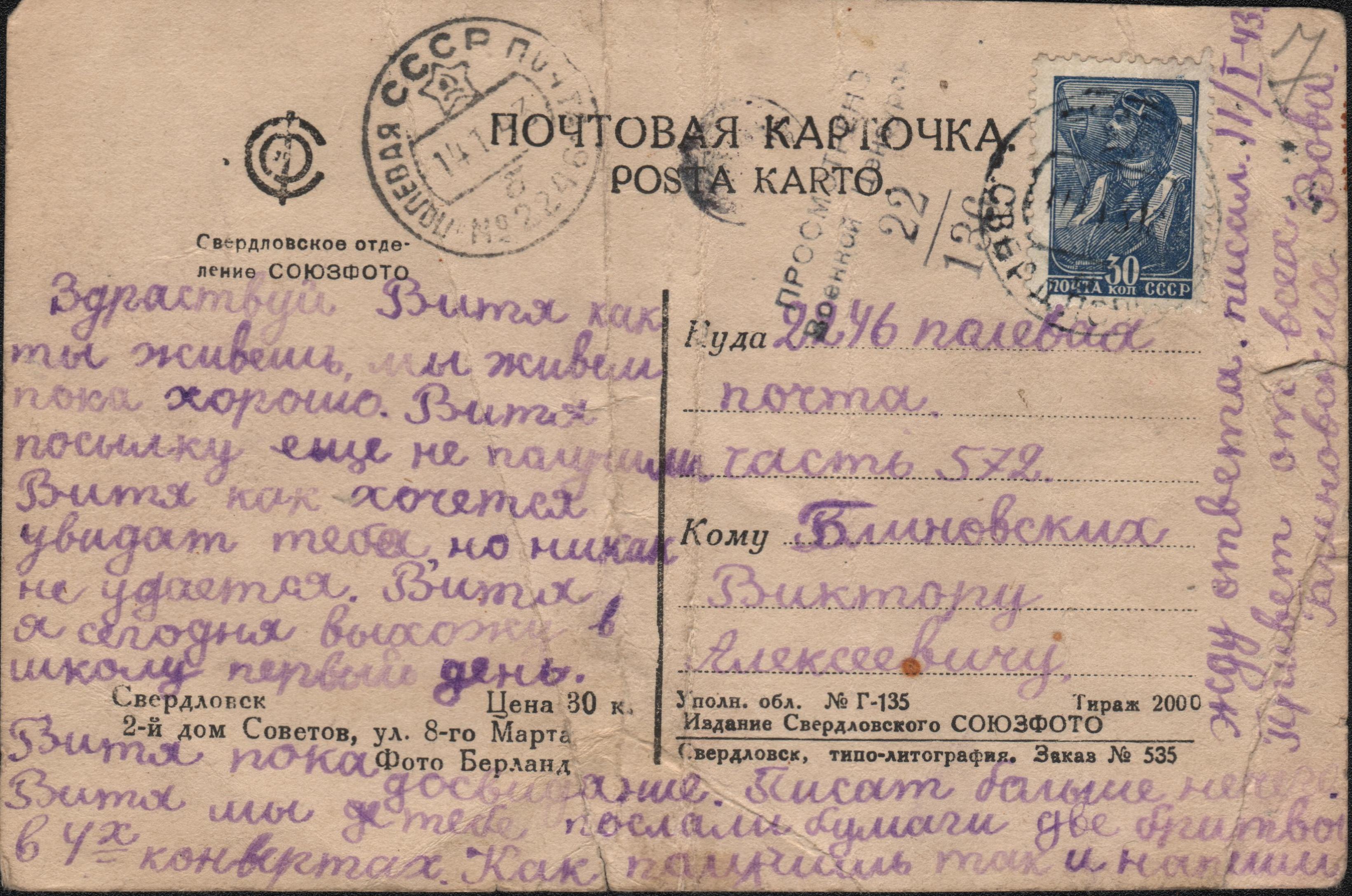 Почтовая открытка на фронт для красноармейца Виктора Алексеевича Блиновских. 2-й дом Советов в Свердловске. Январь 1943 года.