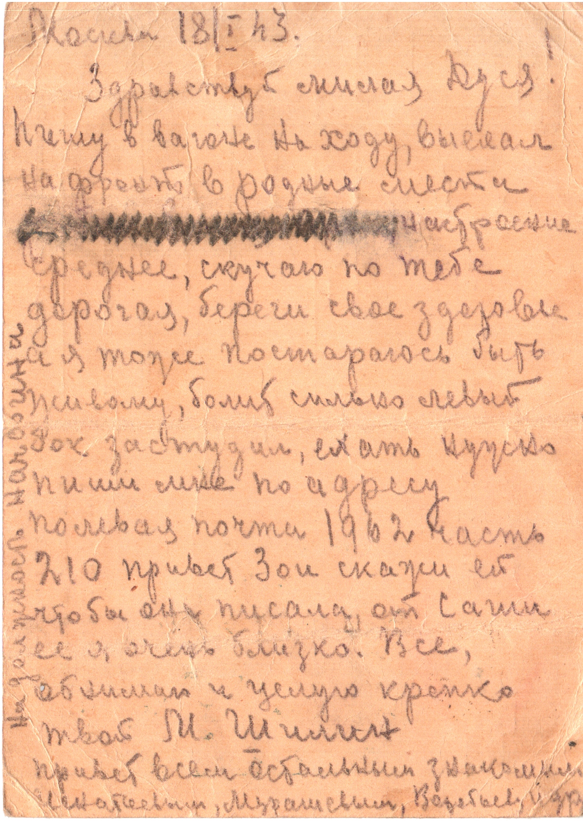 Почтовая карточка с фронта от М. Шилина. 18 января 1943 года.