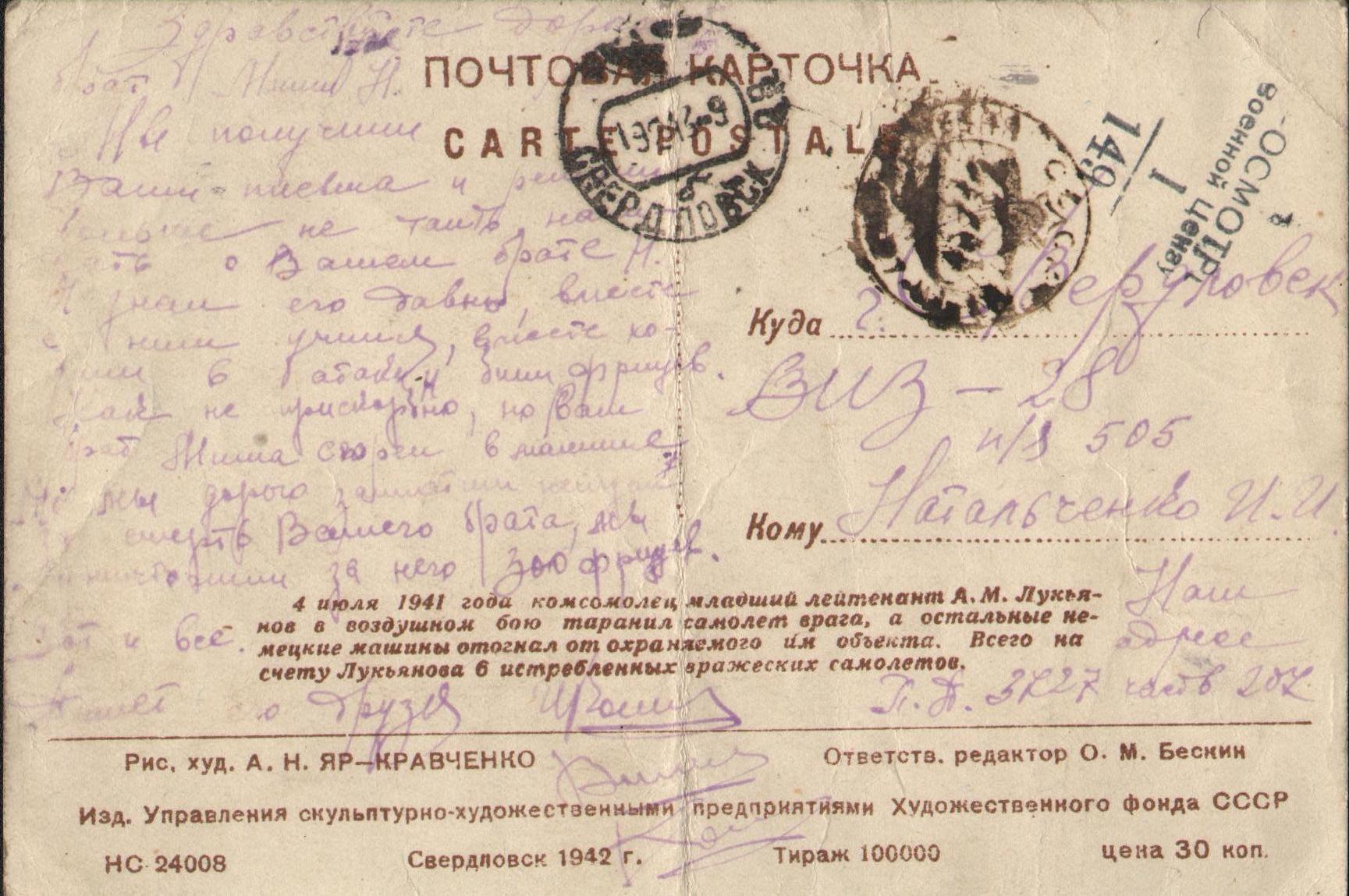 Открытка с фронта о гибели М.И. Натальченко. 1943 год.