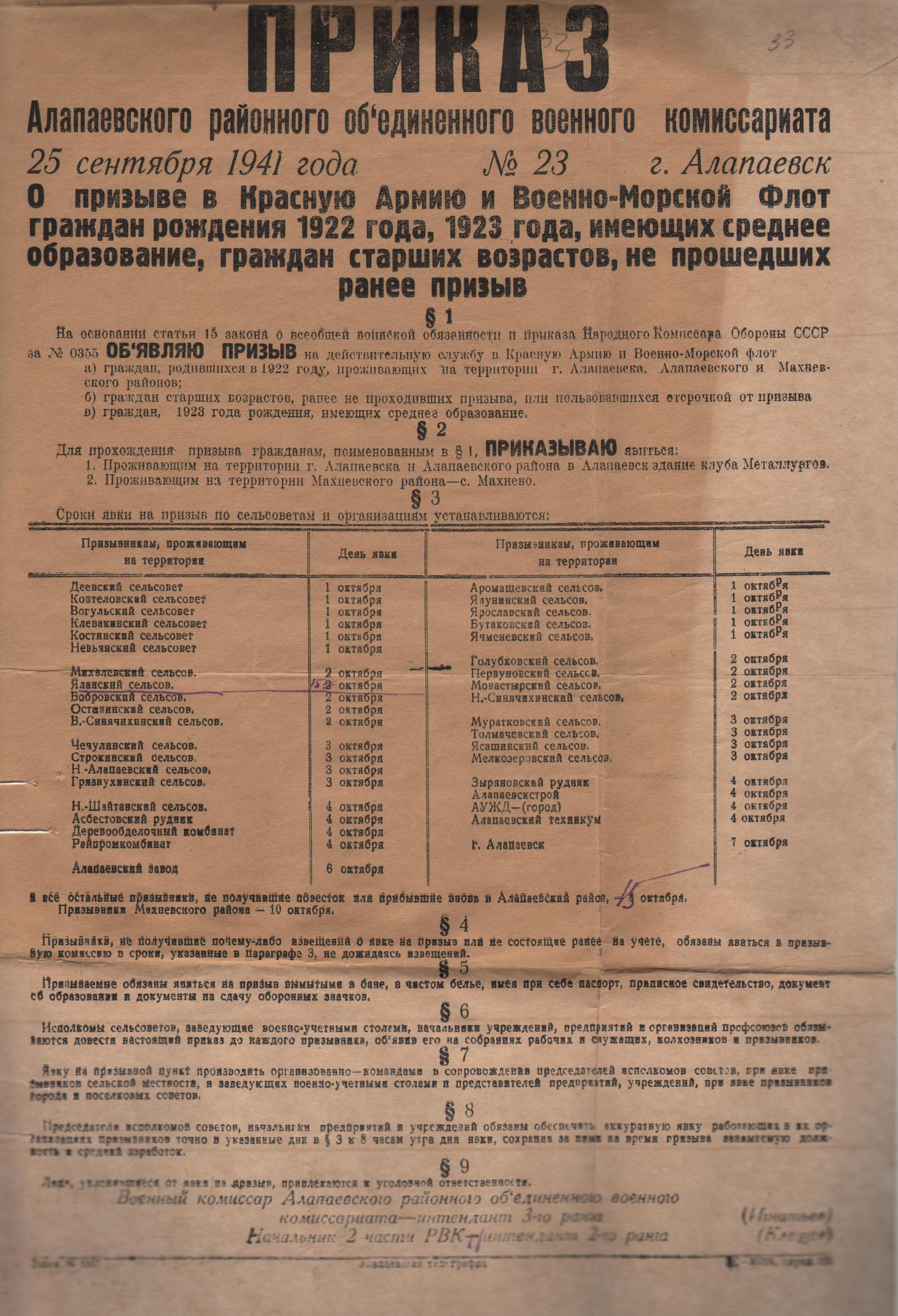 Приказ Алапаевского объединенного военного комиссариата «О призыве в Красную армию». 25 сентября 1941 года.