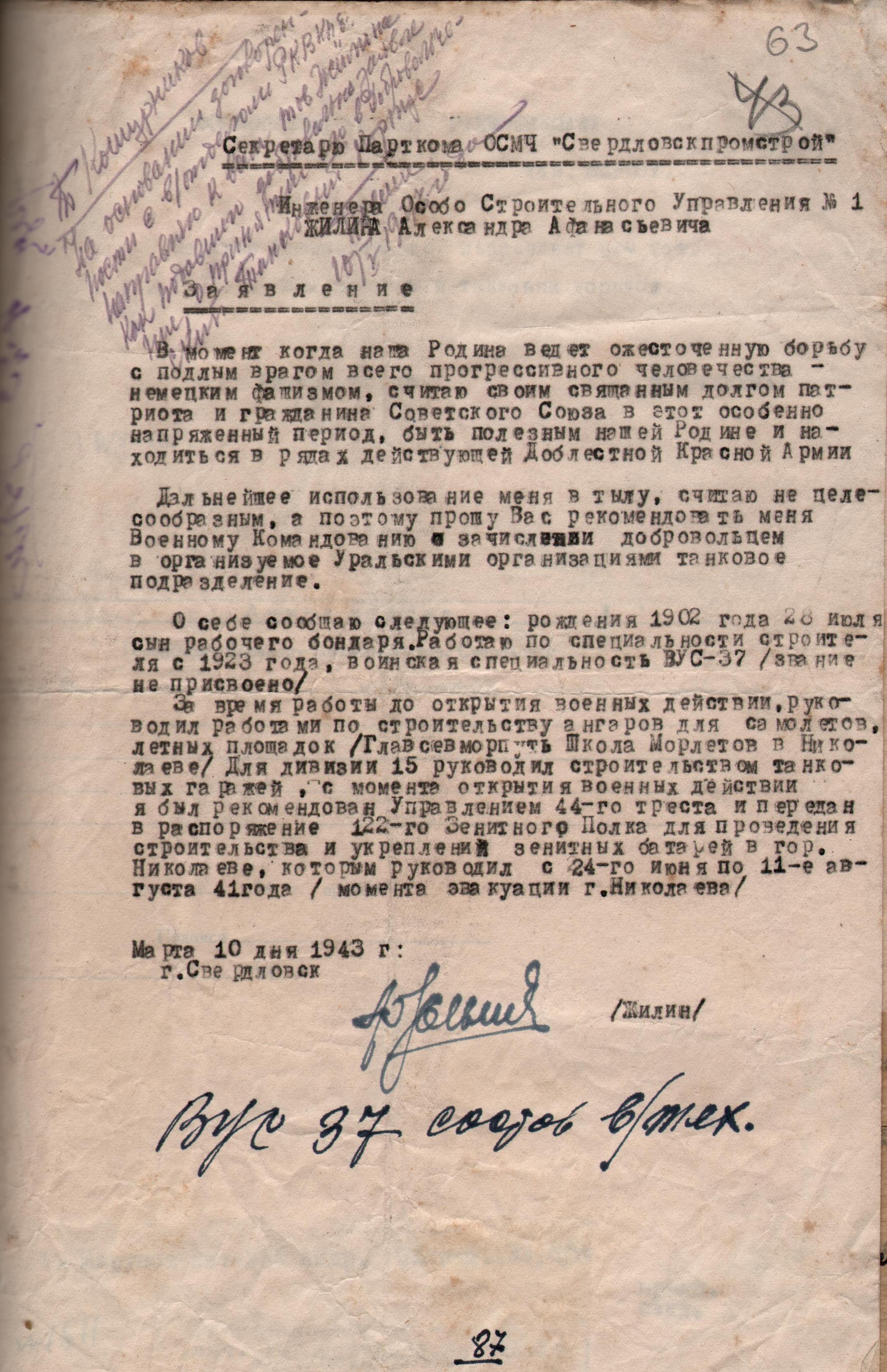 Заявление инженера треста «Свердловскпромстрой» Александра Афанасьевича Жилина о зачислении в состав Уральского добровольческого танкового корпуса 10 марта 1943 года.
