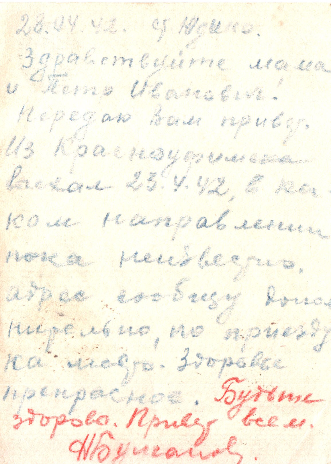 Открытка с фронта красноармейца Николая Тимофеевича Булгакова. 28 апреля 1942 года.
