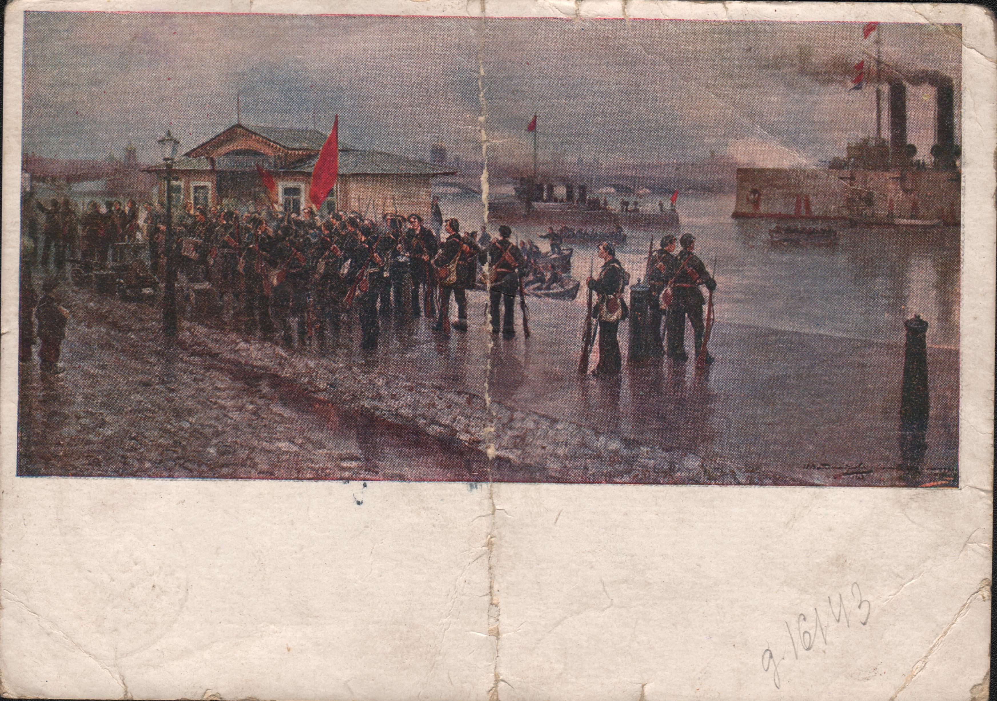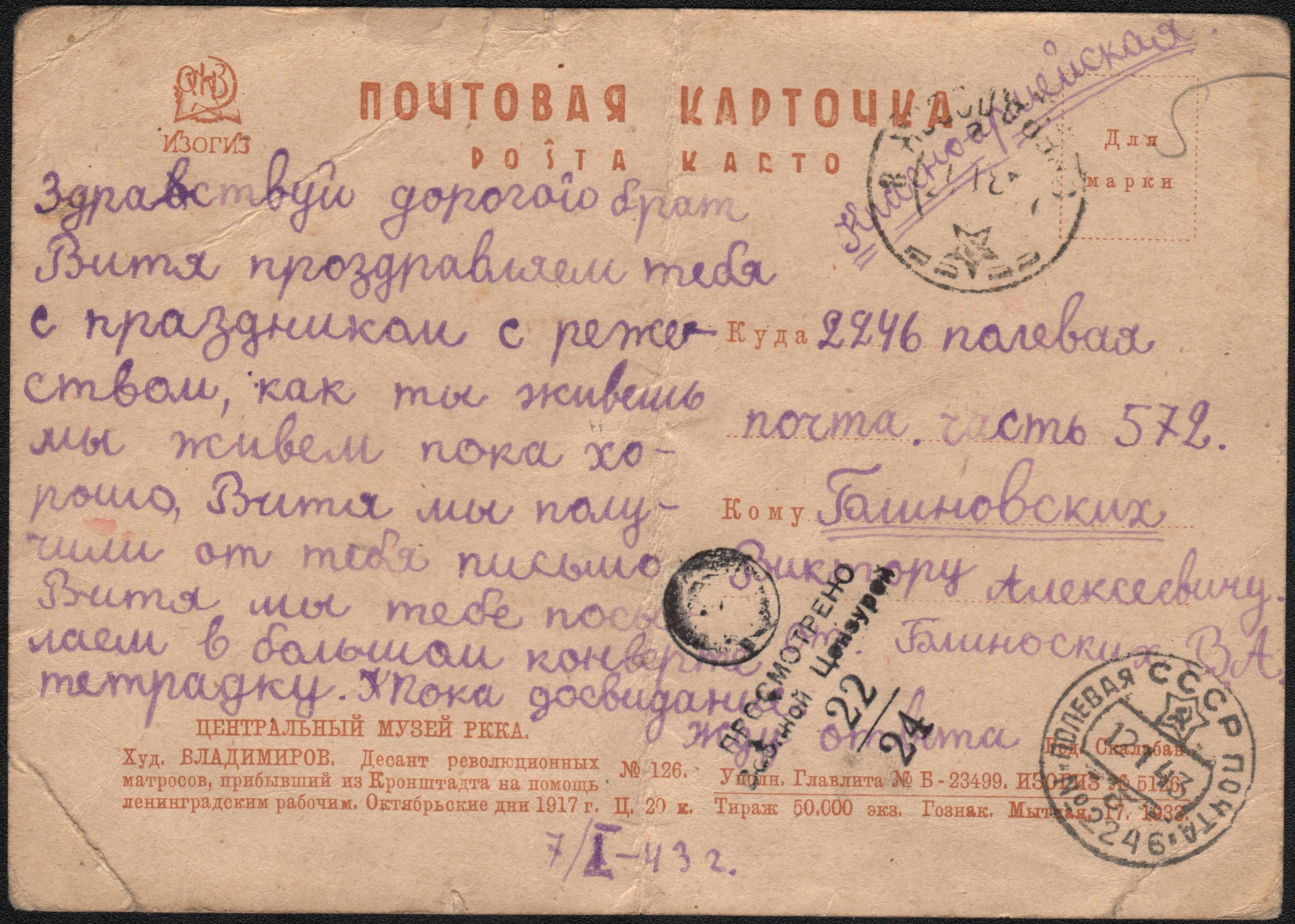 Почтовая открытка на фронт для красноармейца Виктора Алексеевича Блиновских. Десант революционных матросов, прибывший из Кронштадта на помощь ленинградским рабочим. Октябрьские дни 1917 года. 7 января 1943 года.