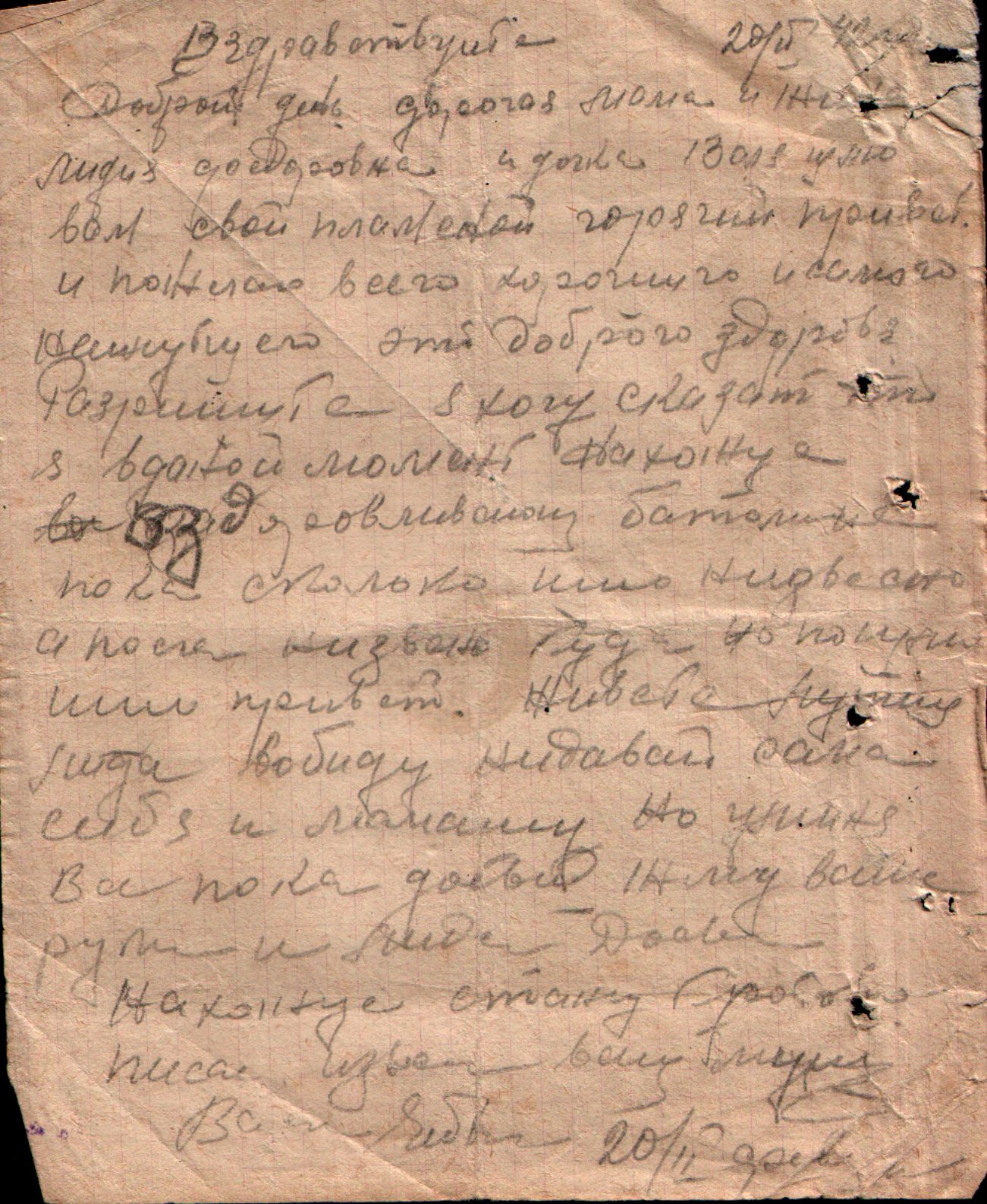 Письмо с фронта Чебыкиной Лидии Федоровне от 20 февраля 1942 года.