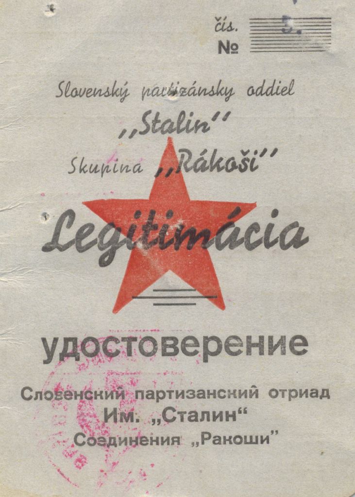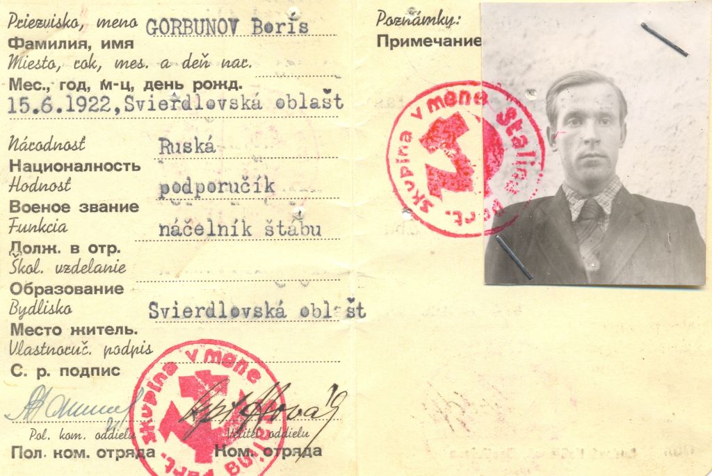 Удостоверение начальника штаба Словенского партизанского отряда Б.И. Горбунова. 1944 г.