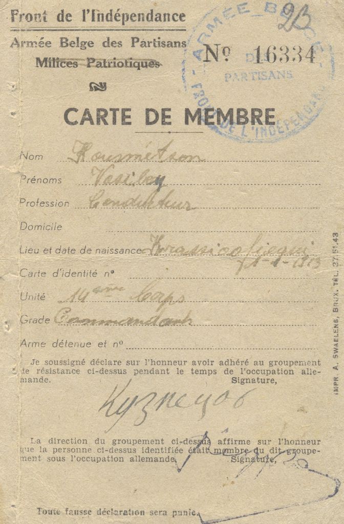Членская карта участника Движения Сопротивления в Бельгии советского военнопленного В.М. Кузнецова. 1944 г.