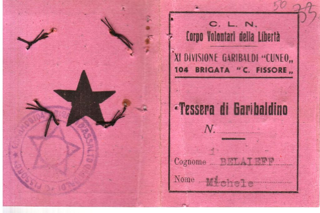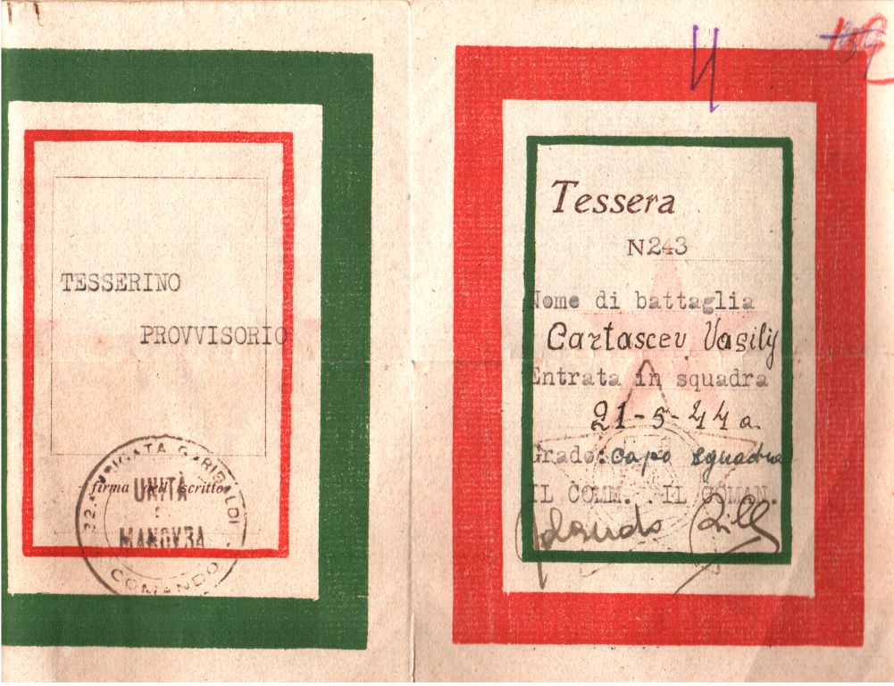 Удостоверение члена итальянского партизанского отряда имени Гарибальди Карташева В.И. 1944 г.