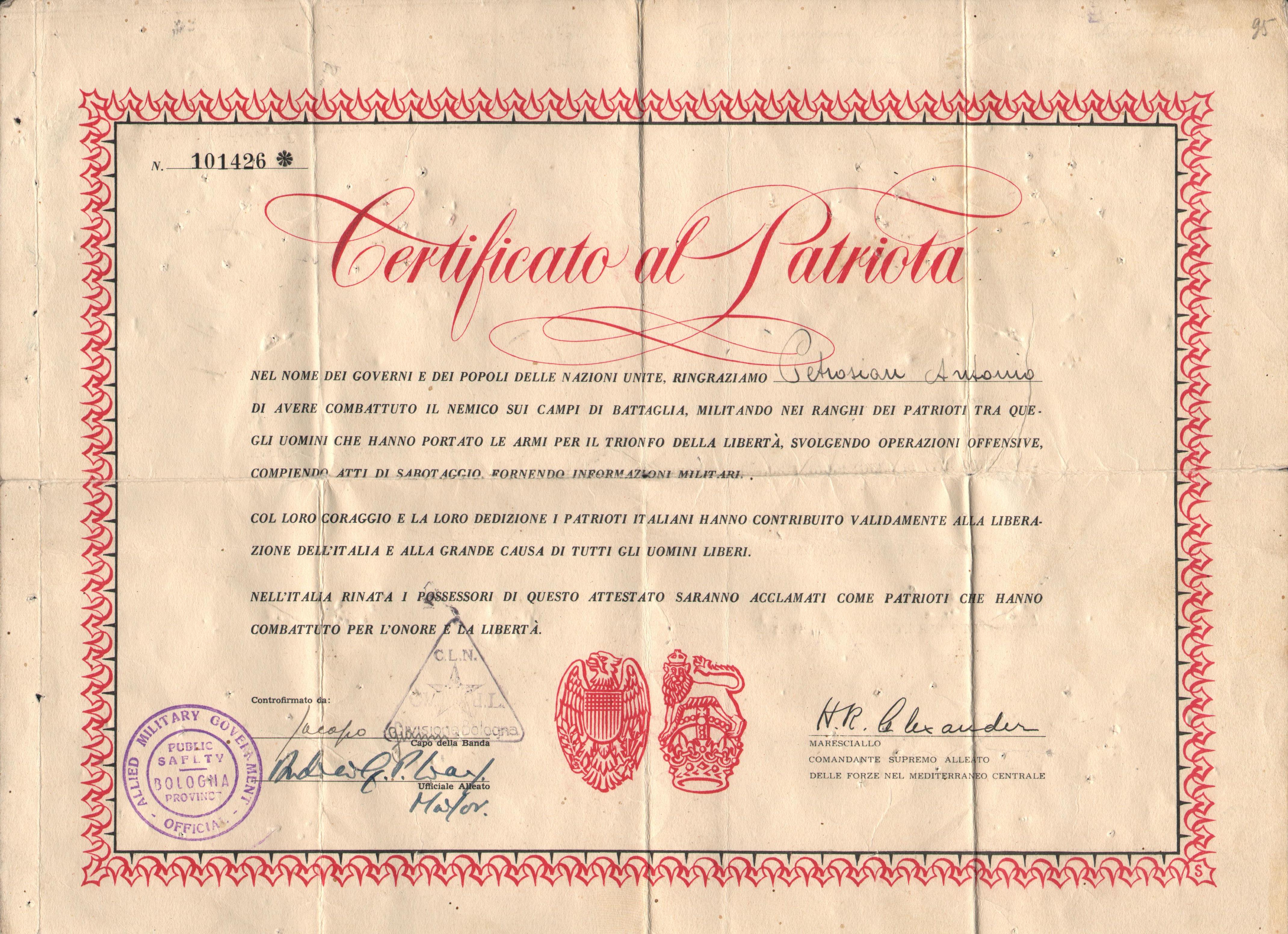 Грамота Патриота итальянского народа итальянского партизана Амаяка Вартановича Петросяна. 1944 год.