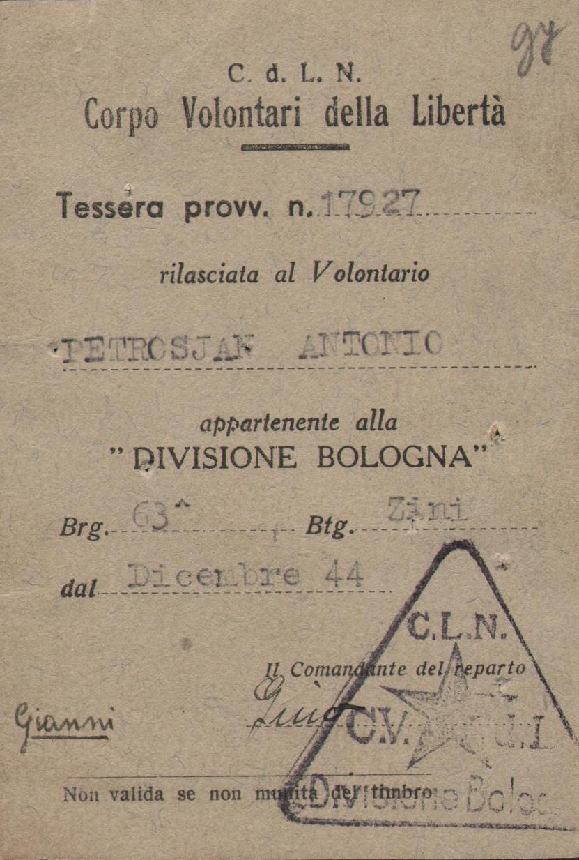 Удостоверение члена итальянского партизанского отряда Амаяка Вартановича Петросяна. 1944 год.