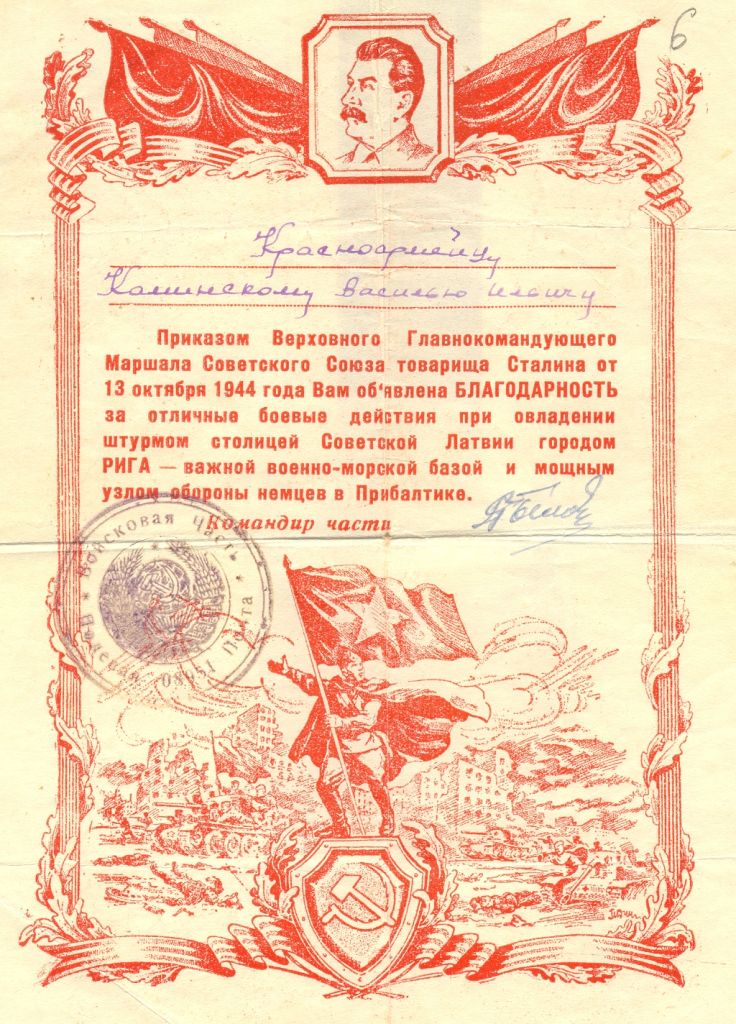 Благодарность Василию Ильичу Каминскому за отличные боевые действия при взятии города Риги (Латвия). 1944 г.