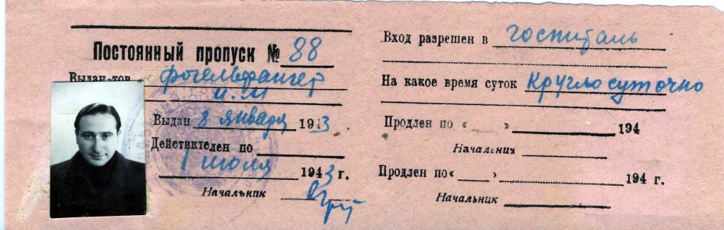 Постоянный пропуск в госпиталь № 88 военврача И.М. Фогельфангера. 1943 г.