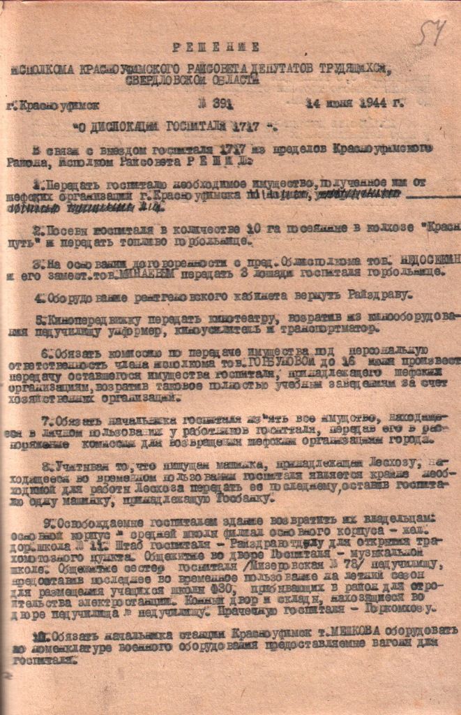 Решение исполнительного комитета Красноуфимского районного Совета депутатов трудящихся Свердловской области от 14 июня 1944 года № 391 «О дислокации госпиталя № 1717». В документе отражены основные положения процесса дислокации госпиталя из г. Красноуфимска и возврата имущества организациям и учреждениям г. Красноуфимска, оказывавшим шефскую помощь госпиталю в период его работы.