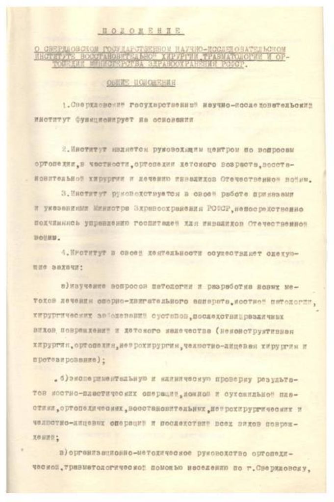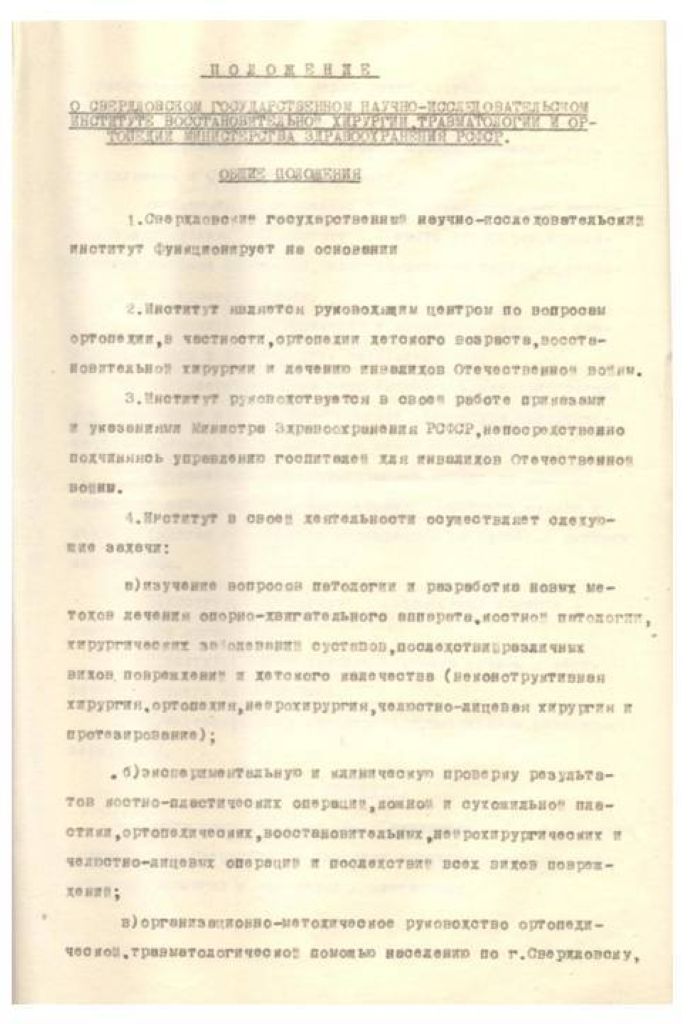 Положение о Свердловском Государственном научно-исследовательском института восстановительной хирургии, травматологии и ортопедии Министерства здравоохранения РСФСР.