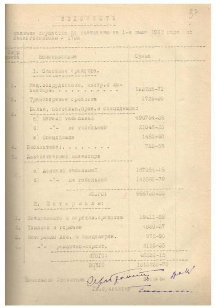 Ведомость наличия имущества по состоянию на 1 июня 1942 года по Эвакогоспиталю № 1705.