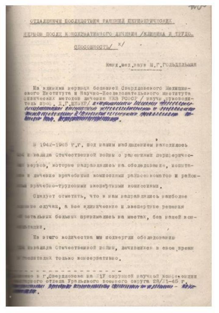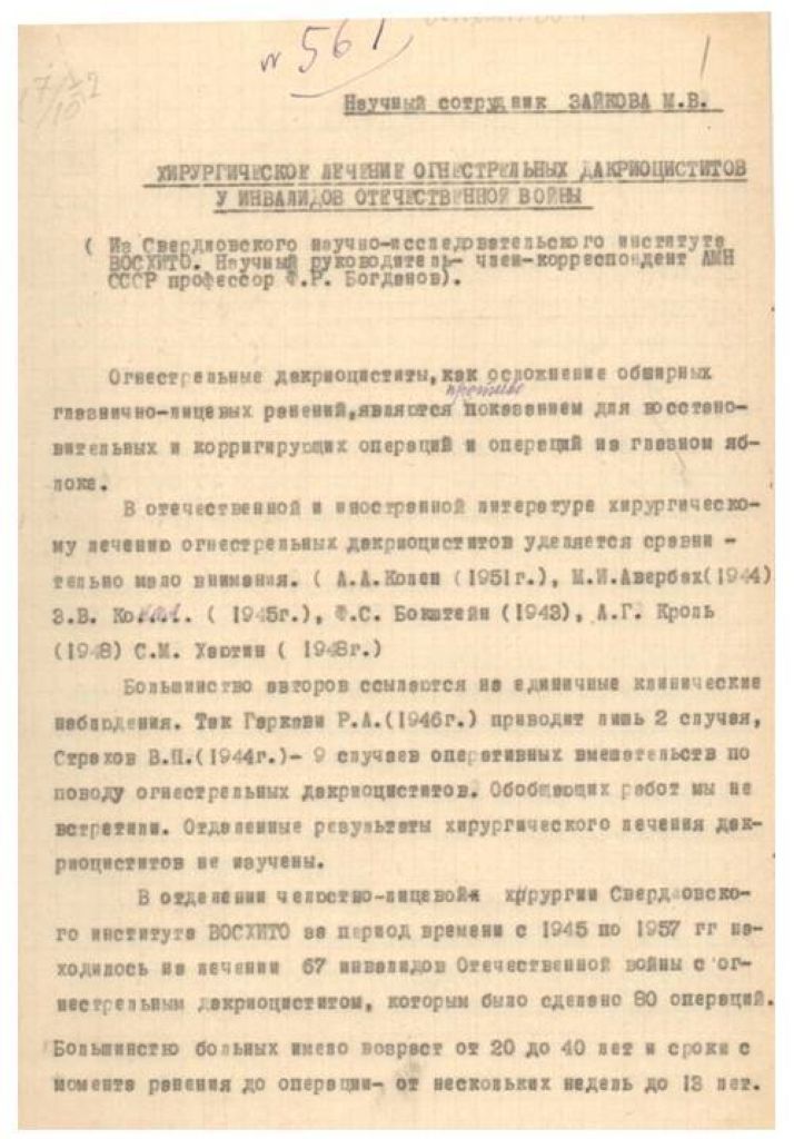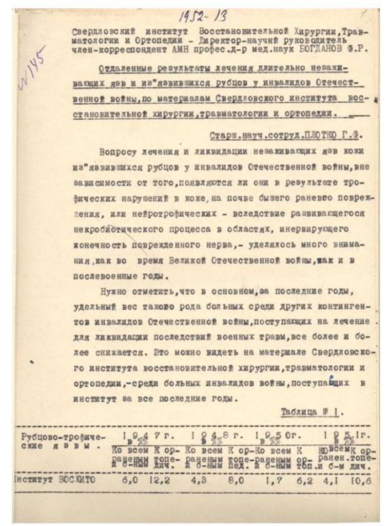 Отдаленные результаты лечения длительно незаживающих язв и изъязвившихся рубцов у инвалидов Отечественной войны, по материалам Свердловского института восстановительной хирургии, травматологии и ортопедии.