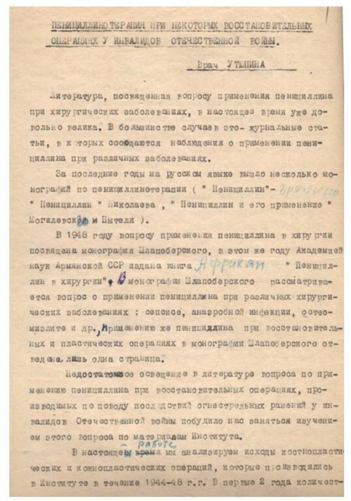 Пенициллинотерапия при некоторых восстановительных операциях у инвалидов Отечественной войны.