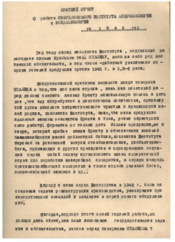 Краткий отчет о работе Свердловского института микробиологии и эпидемиологии за 1942 год.