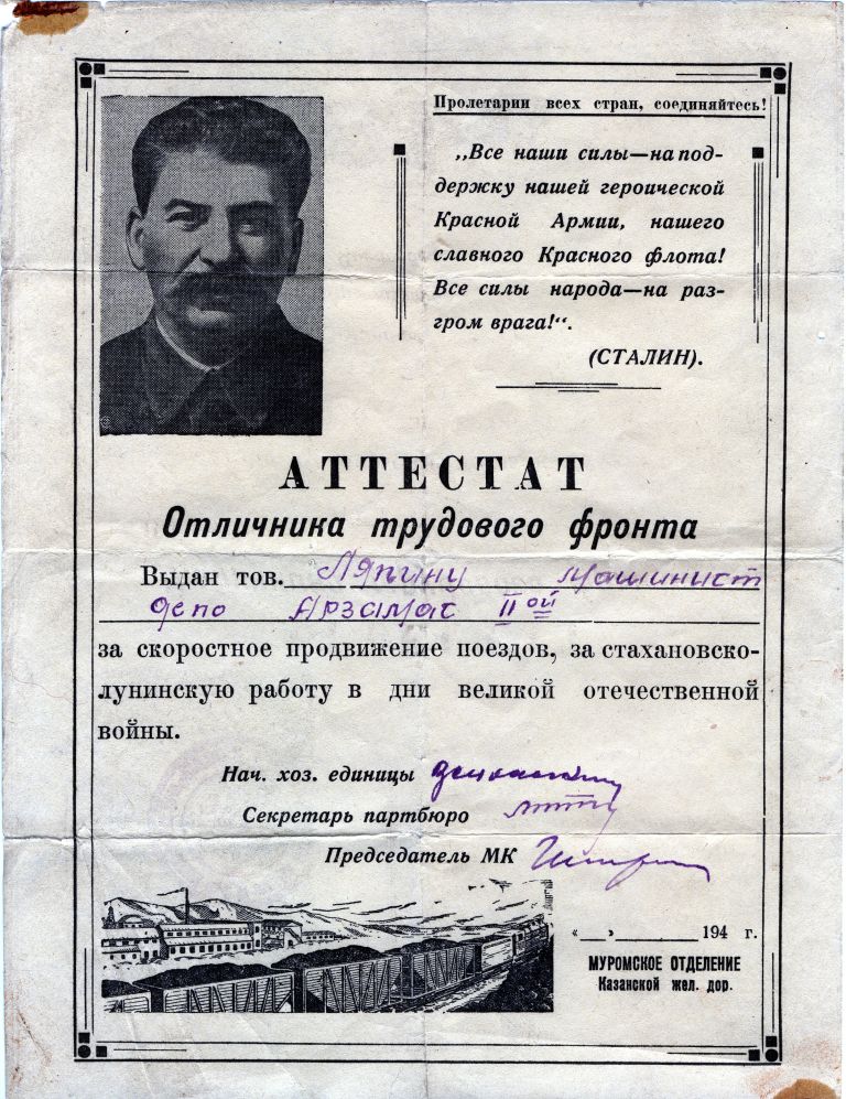 Аттестат отличника трудового фронта в годы Великой Отечественной войны, выданный машинисту депо Ляпину Алексею Ивановичу. 1943 г.