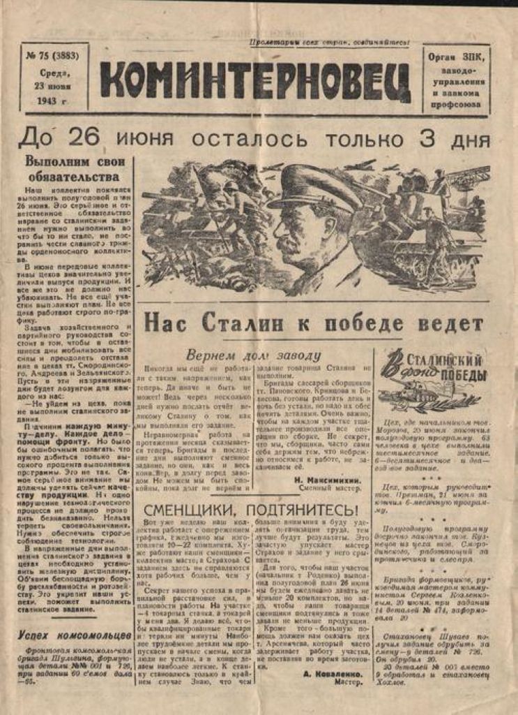 Газета «Коминтерновец» (г. Нижний Тагил). Завод № 183 Народного Комиссариата Тяжелой промышленности (ныне Уралвагонзавод). 23 июня 1943 года.