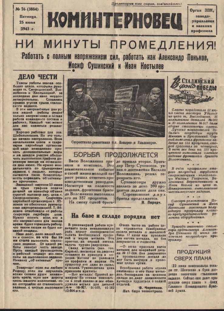 Газета «Коминтерновец» (г. Нижний Тагил). Завод № 183 Народного Комиссариата Тяжелой промышленности (ныне Уралвагонзавод). 25 июня 1943 года.