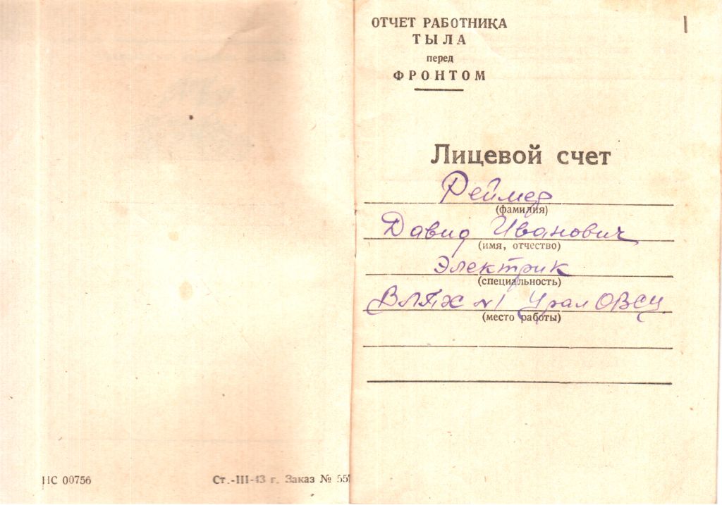 Лицевой счёт Давида Ивановича Реймера – электрика военно-лесопромышленного хозяйства № 1 Уральского Окружного военно-строительного управления «Отчет работника тыла перед фронтом». 1943 г.