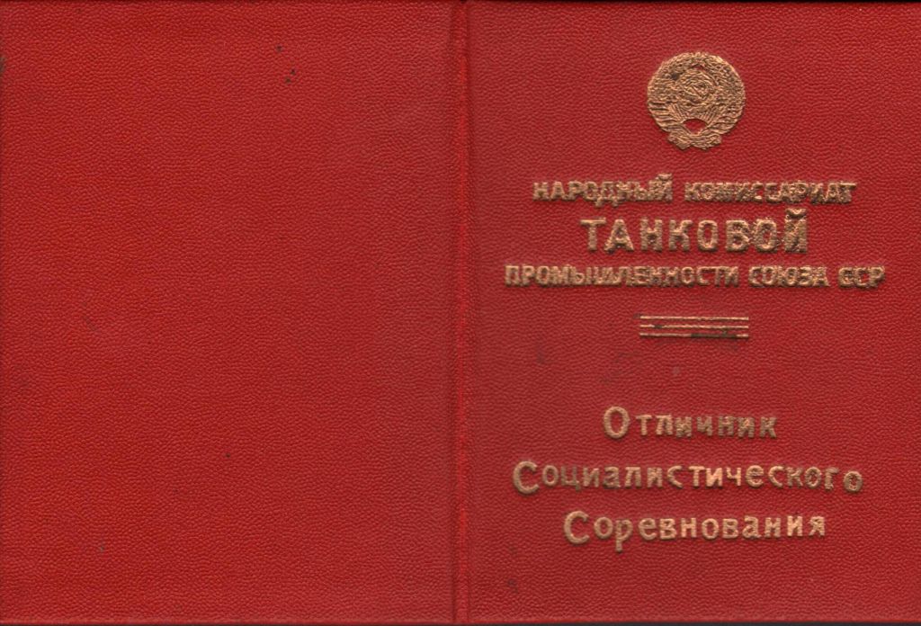 Удостоверение к значку «Отличник социалистического соревнования Наркомата танковой Промышленности Союза ССР», выданное столяру «Уралмашзавода» А.Я. Основину. 27 марта 1943 года.