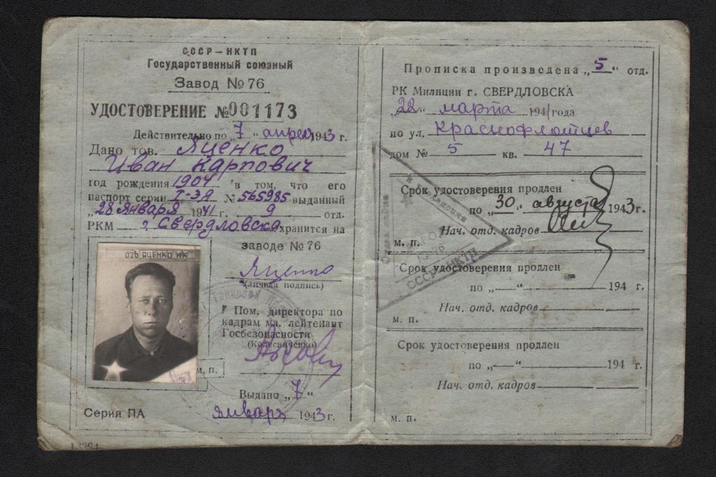 Удостоверение рабочего завода № 76 (Уральского турбо-завода города Свердловска) Ивана Карповича Яценко. Январь 1943 года.