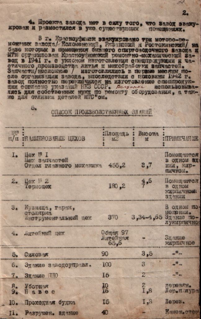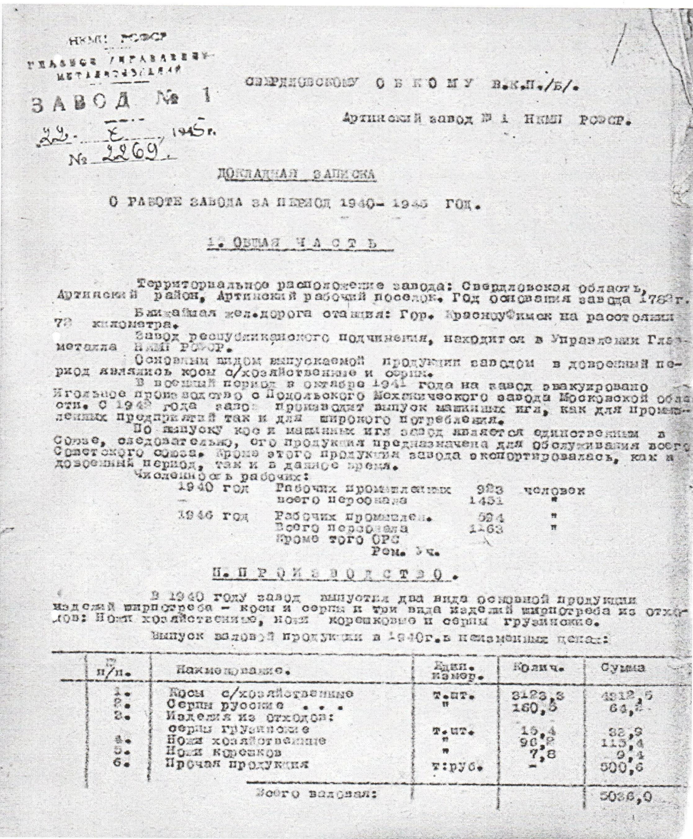 Докладная записка о работе Артинского завода за период 1941–1945 гг.
