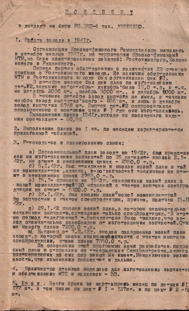 Н.Ф. Дзюбенко – директор Красноуфимского ремонтно-механического завода, образованного в результате слияния трех эвакуированных в г. Красноуфимск заводов (Ростокинского, Коломенского, Рязанского) и Красноуфимской машинно-тракторной мастерской в 1941 году. В документе отражены основные показатели работы завода в 1941 году - производительность труда, стахановское движение, культурно-массовая работа и др.