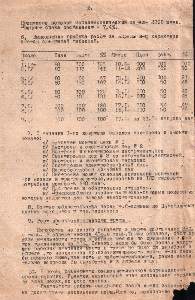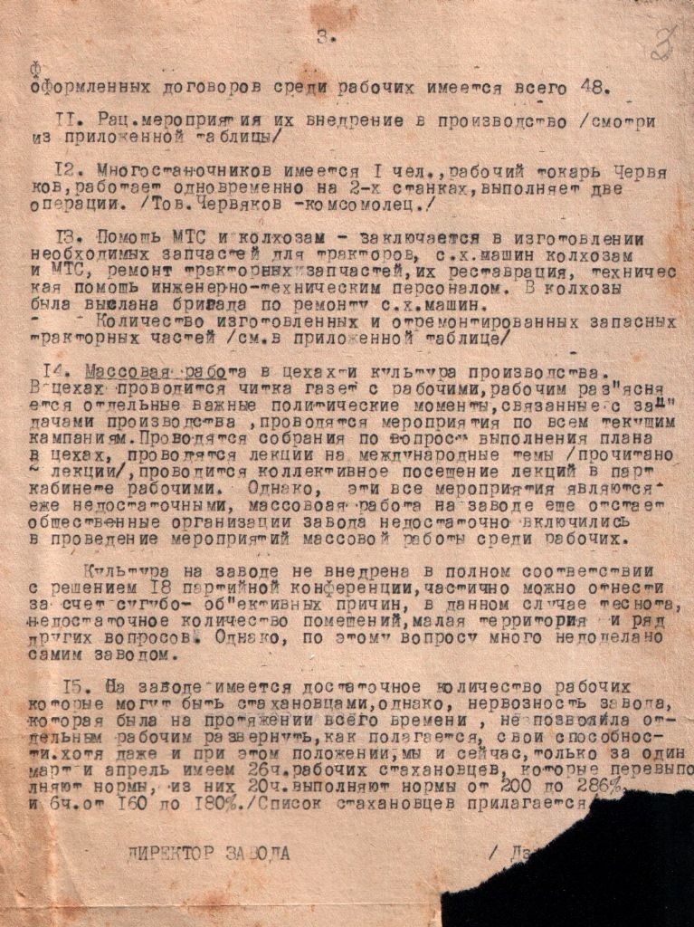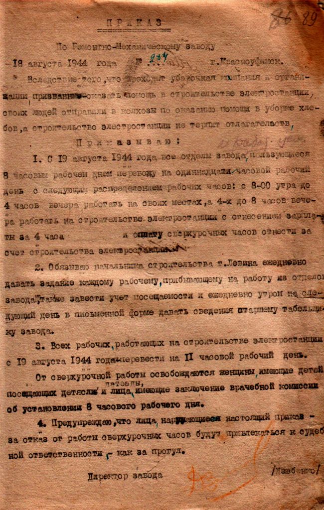 «Приказ по ремонтно-механическому заводу» от 18 августа 1944 года № 284 о переводе всех отделов завода на 11-часовой рабочий день. Перевод режима труда с 8 часов в день до 11 был необходим для строительства электростанции с целью увеличения мощности работы завода. Приказ регламентировал учет посещаемости, освобождение от сверхурочных работ, меры ответственности за нарушение дисциплины.
