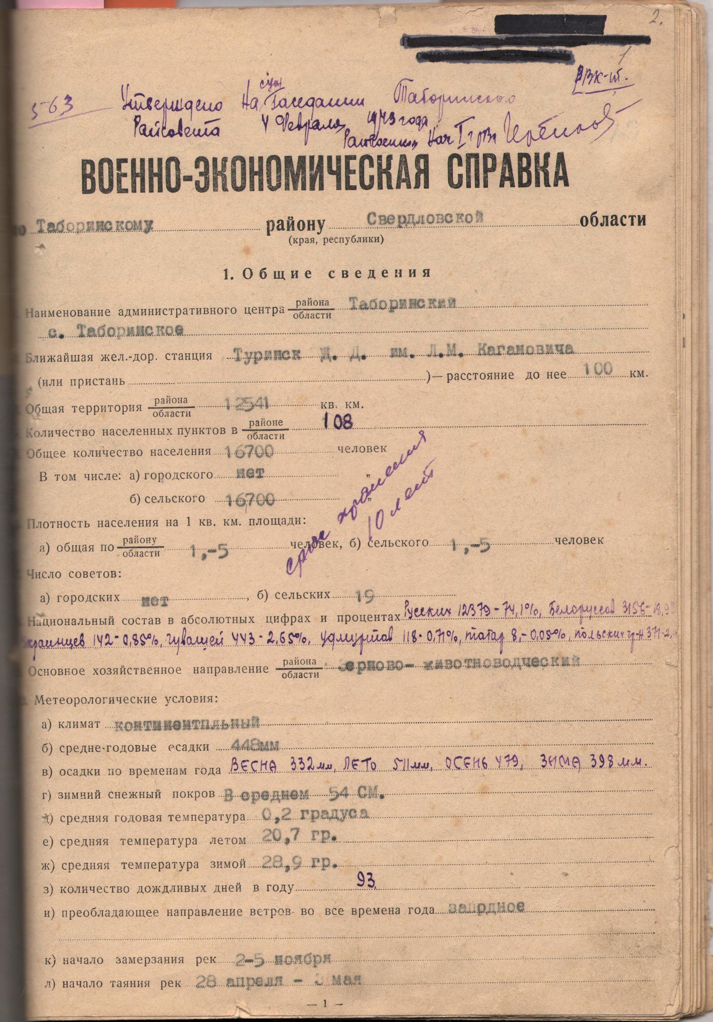 Военно-экономическая справка Таборинского района Свердловской области за 1943 год. 1 февраля 1943 года.