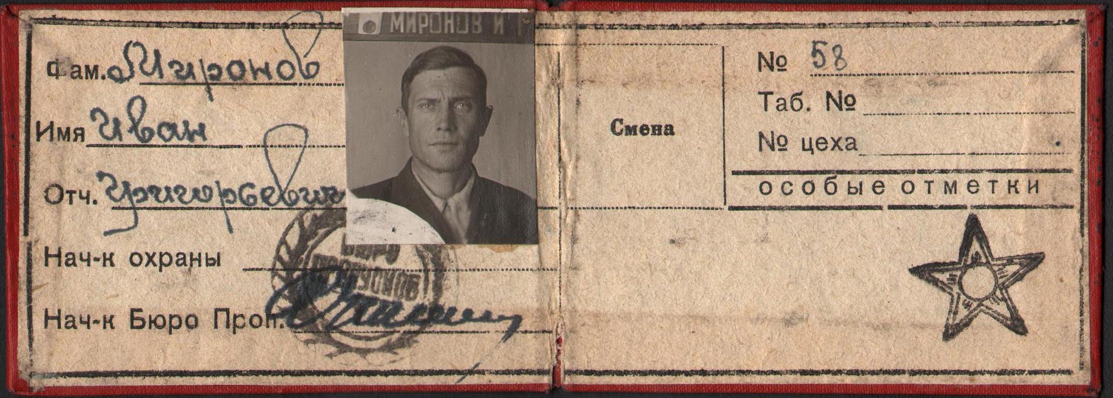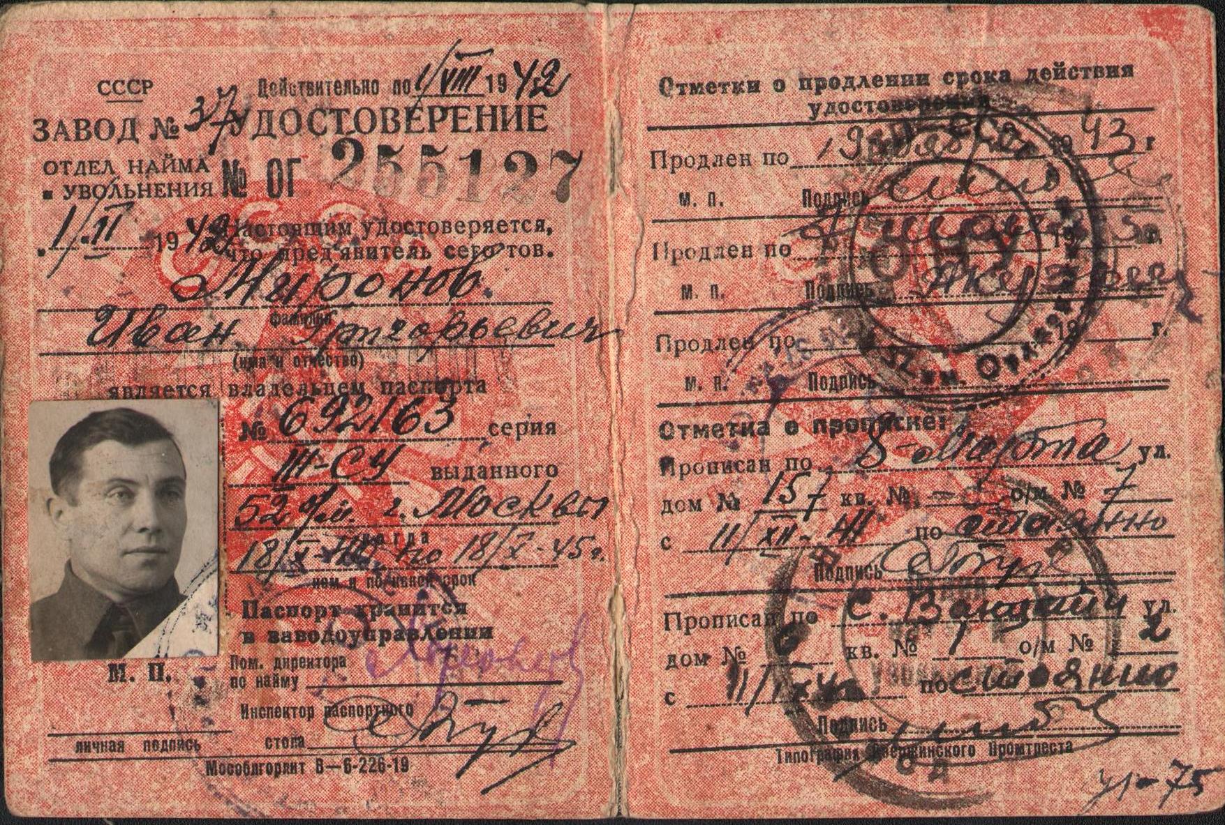 Удостоверение рабочего завода № 37 города Свердловска Ивана Григорьевича Миронова. 1944 год.