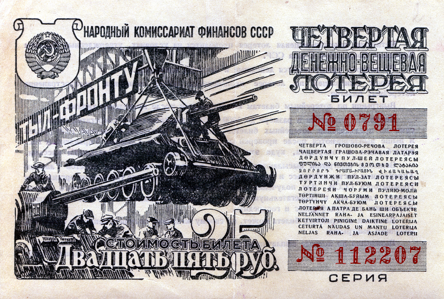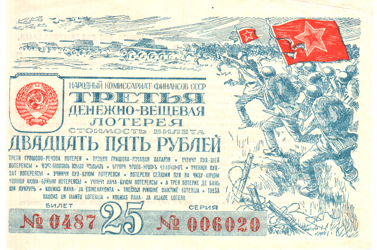 Билет денежно-вещевой лотереи стоимостью 25 рублей. 1944 год.