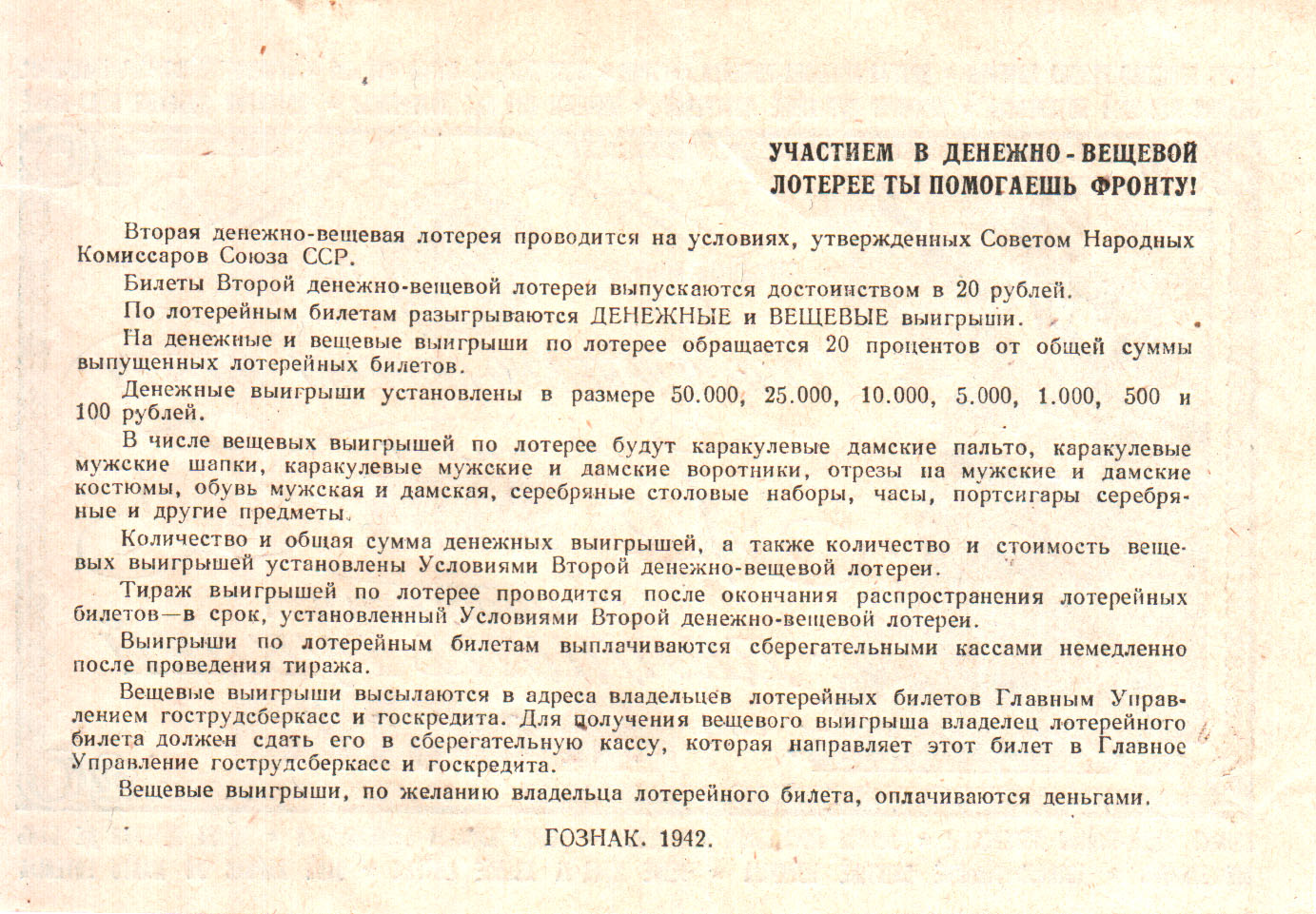Билет денежно-вещевой лотереи стоимостью 20 рублей с оборотом. 1942 год.
