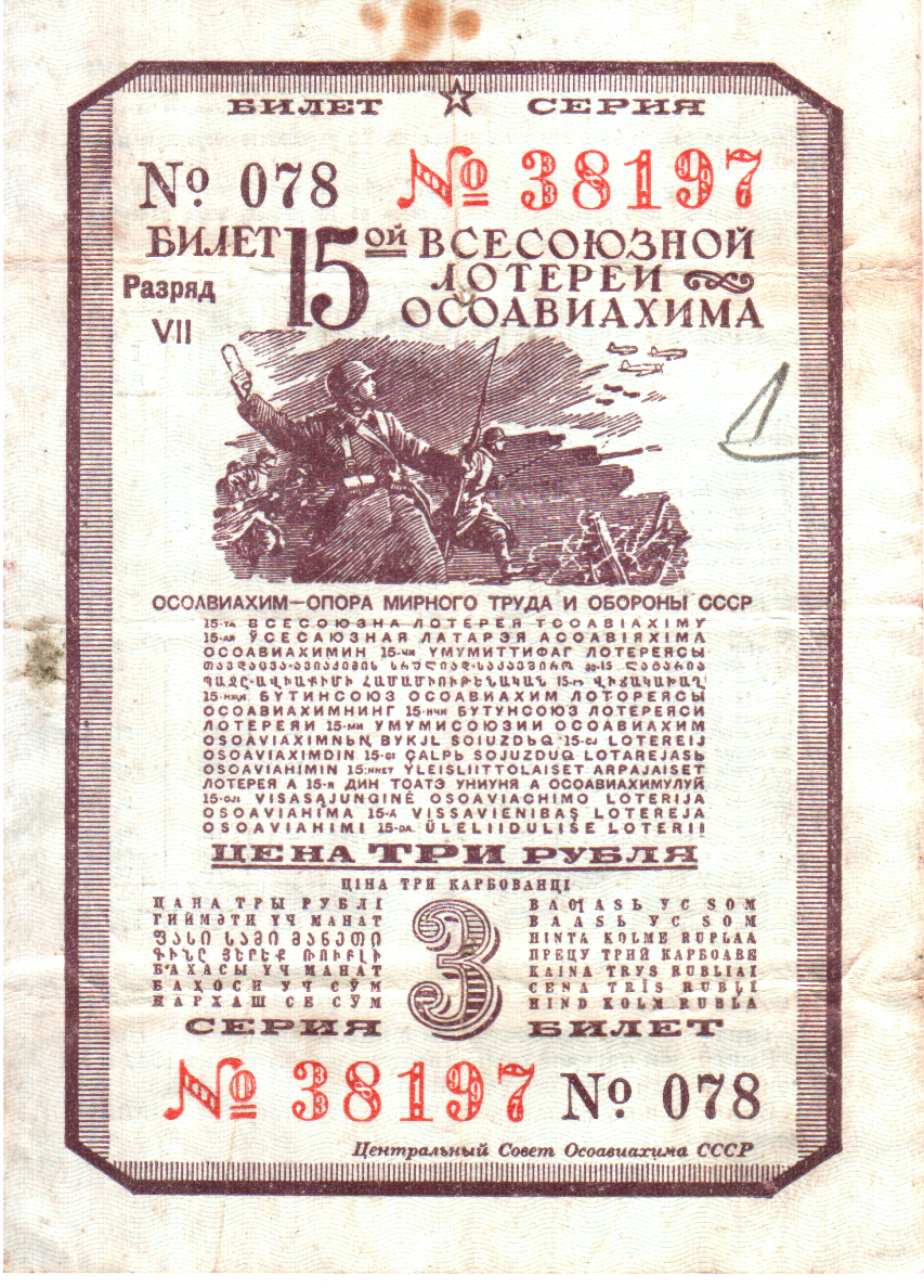 Билет денежно-вещевой лотереи стоимостью 3 рубля. 1941 год.