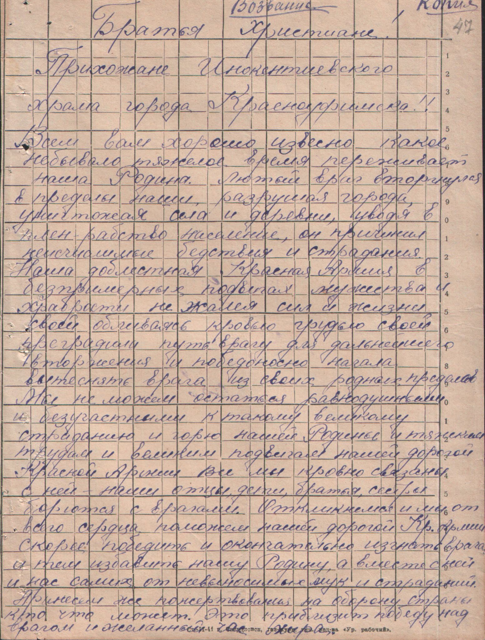 Воззвание прихожан Иннокентьевского храма города Красноуфимска о пожертвовании на оборону страны. 1943 год.