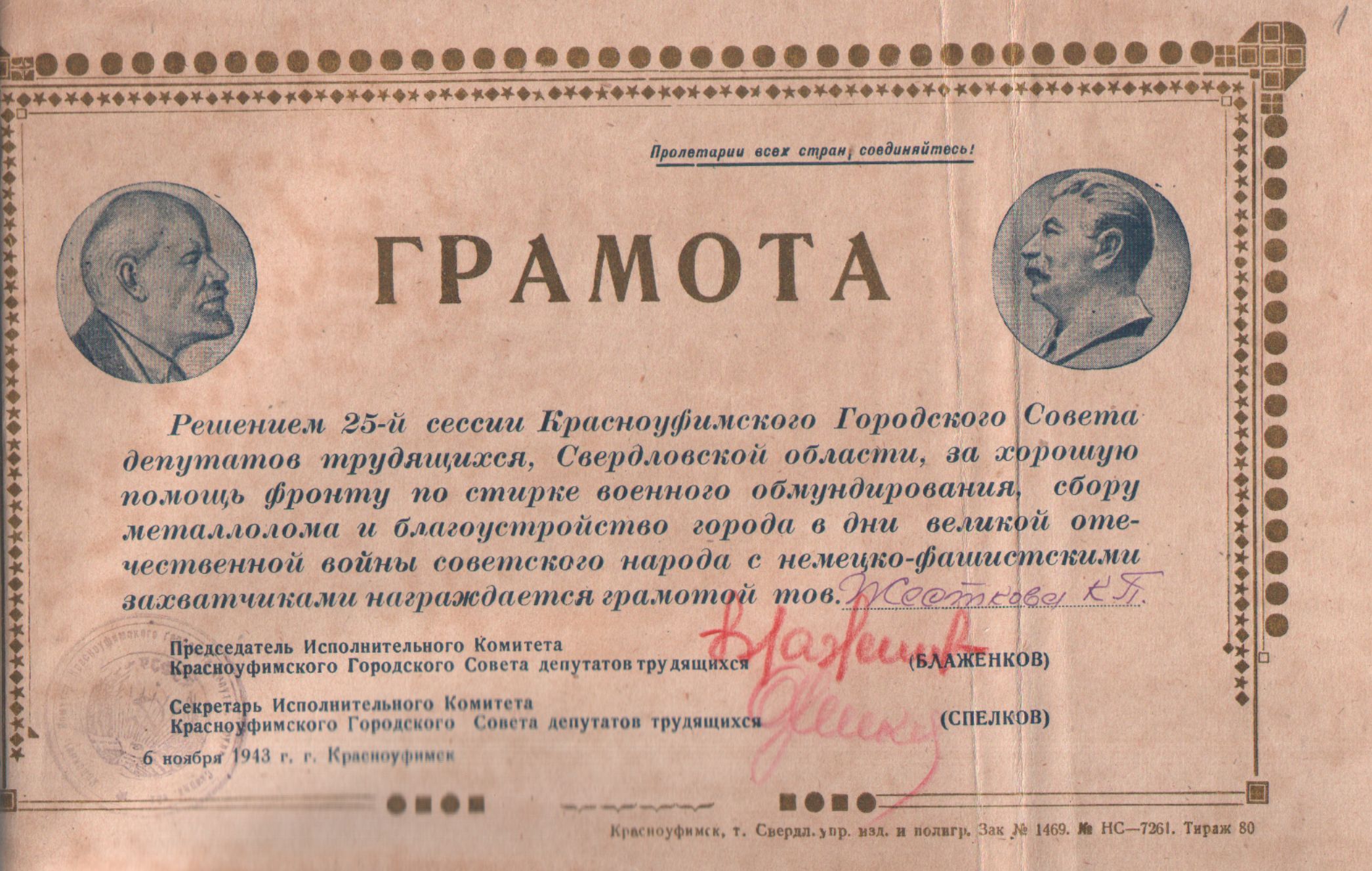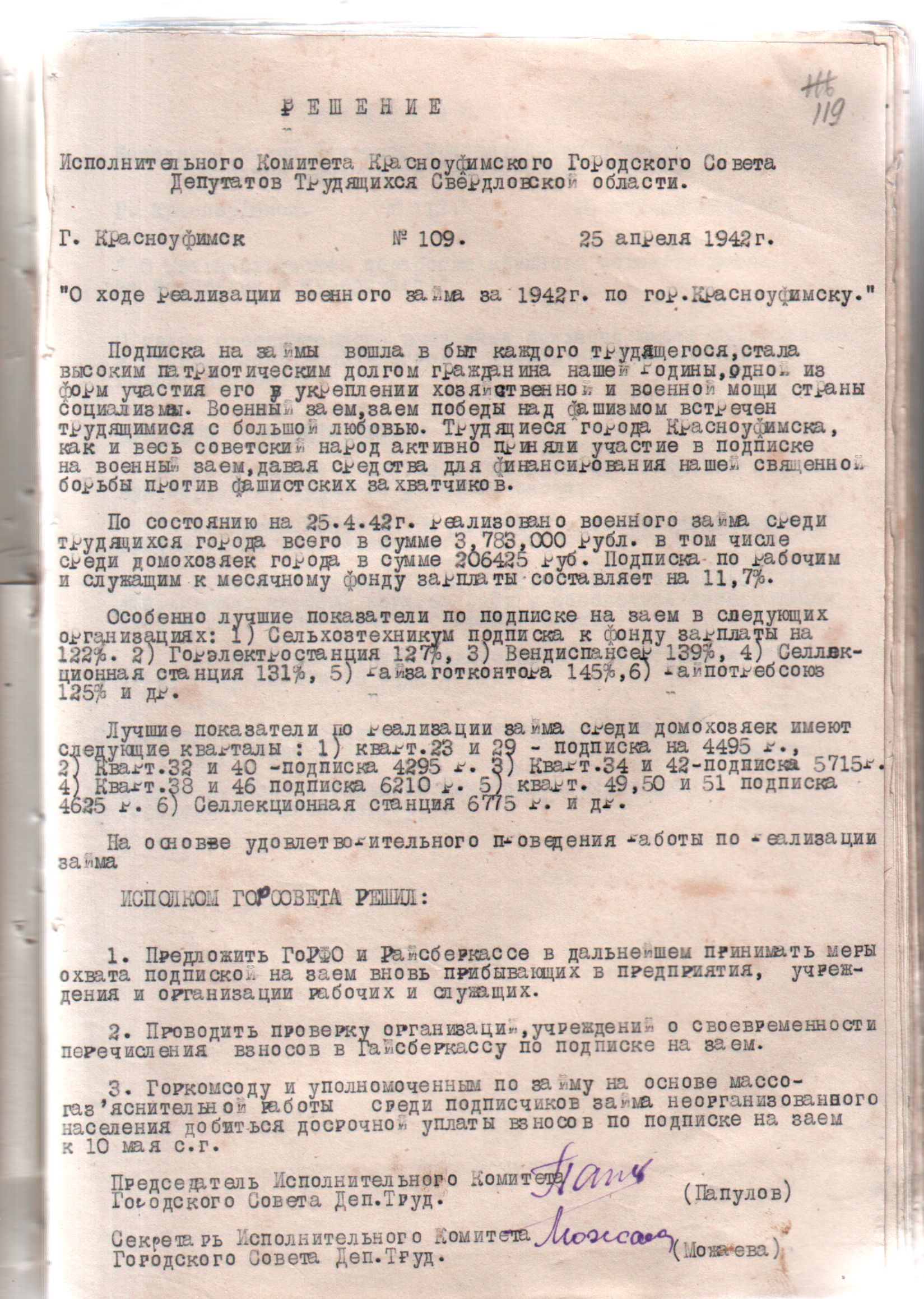 Решение Исполнительного комитета Красноуфимского городского Совета депутатов трудящихся Свердловской области от 25 апреля 1942 года № 109 «О ходе реализации военного займа за 1942 год по городу Красноуфимску».