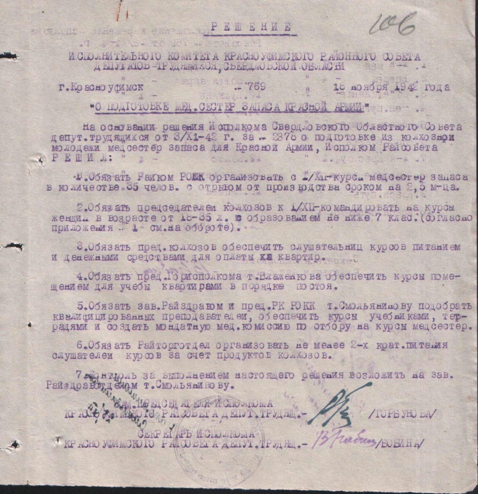 Решение Исполнительного комитета Красноуфимского городского Совета депутатов трудящихся Свердловской области от 18 ноября 1942 года № 769 «О подготовке медсестер запаса Красной Армии».