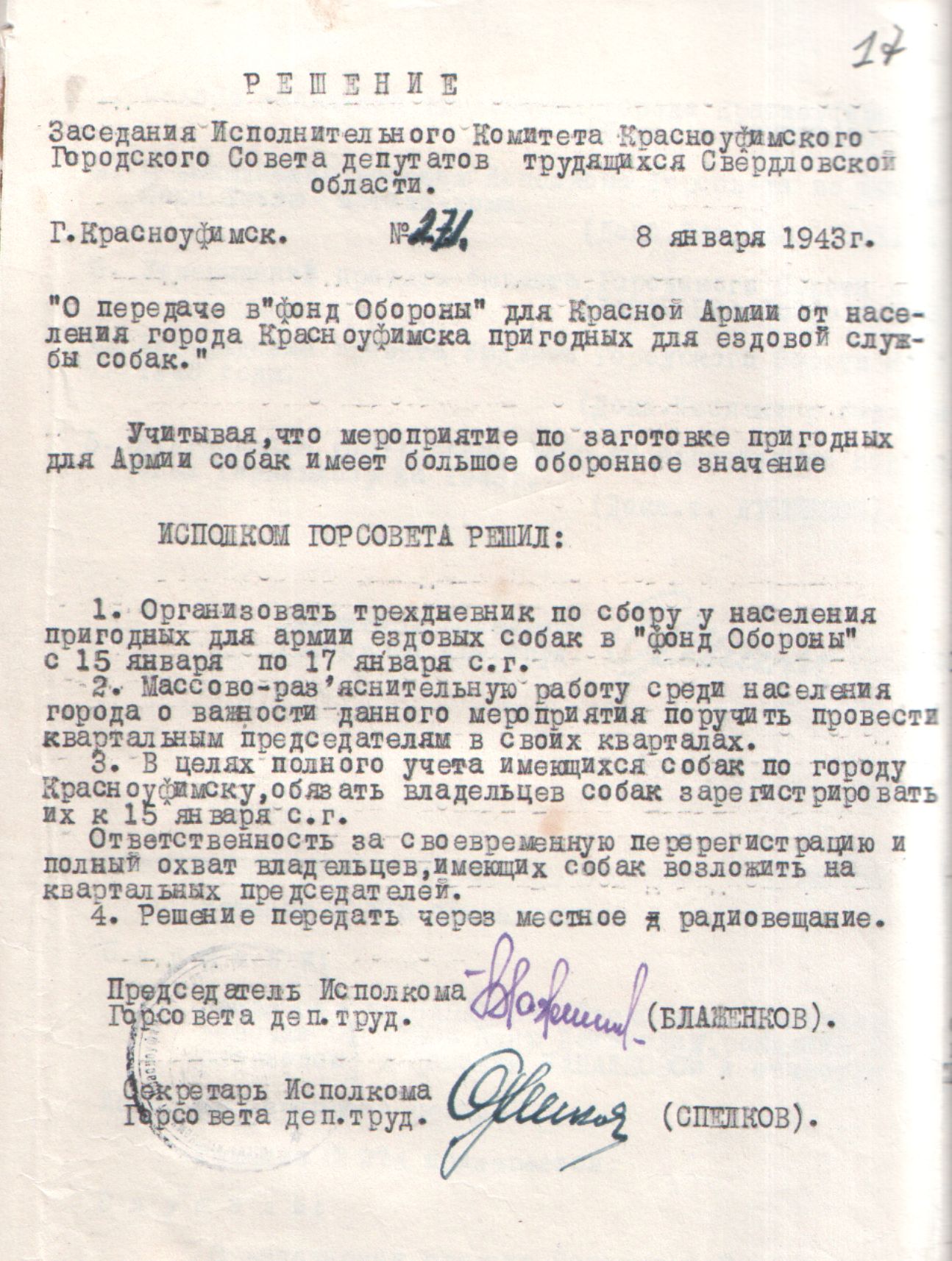 Решение Исполнительного комитета Красноуфимского городского Совета депутатов трудящихся Свердловской области от 08 января 1943 года № 271 «О передаче в «фонд Обороны» для Красной Армии от населения города Красноуфимска пригородных для ездовой службы собак».